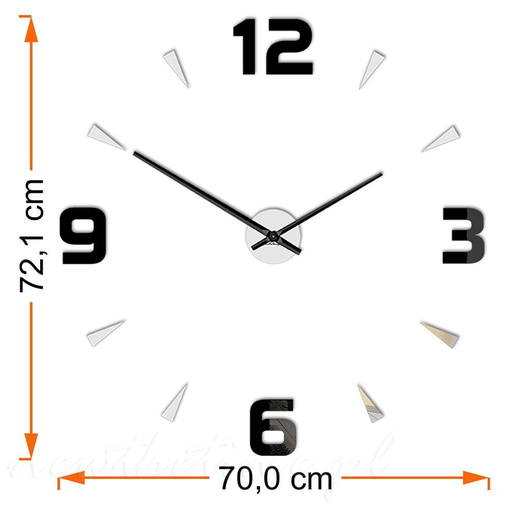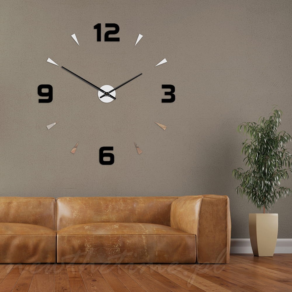 Nowoczesny, naklejany zegar na ścianę SHOT składający się z czarnych lub lustrzanych kreseczek.
