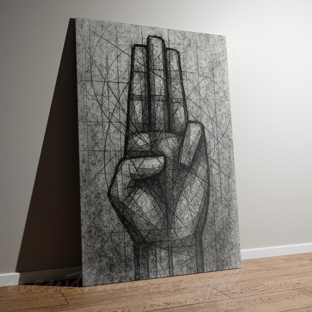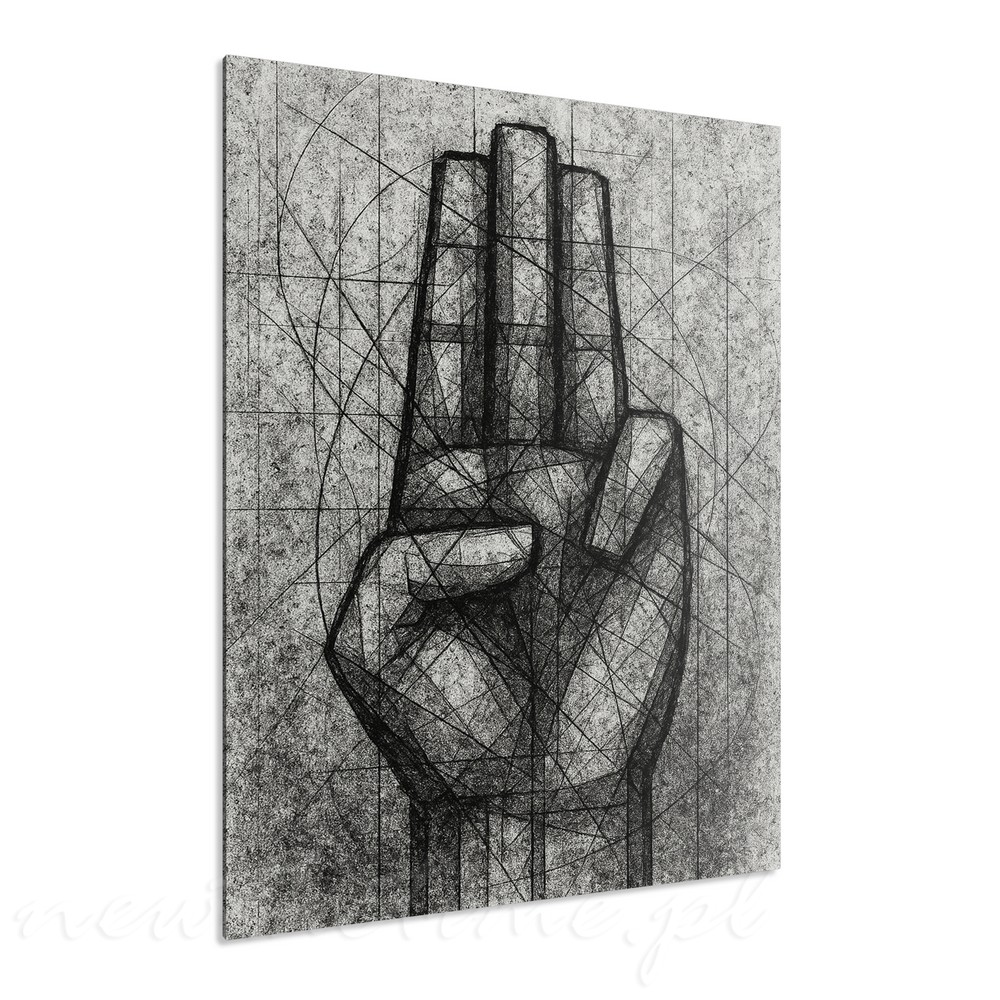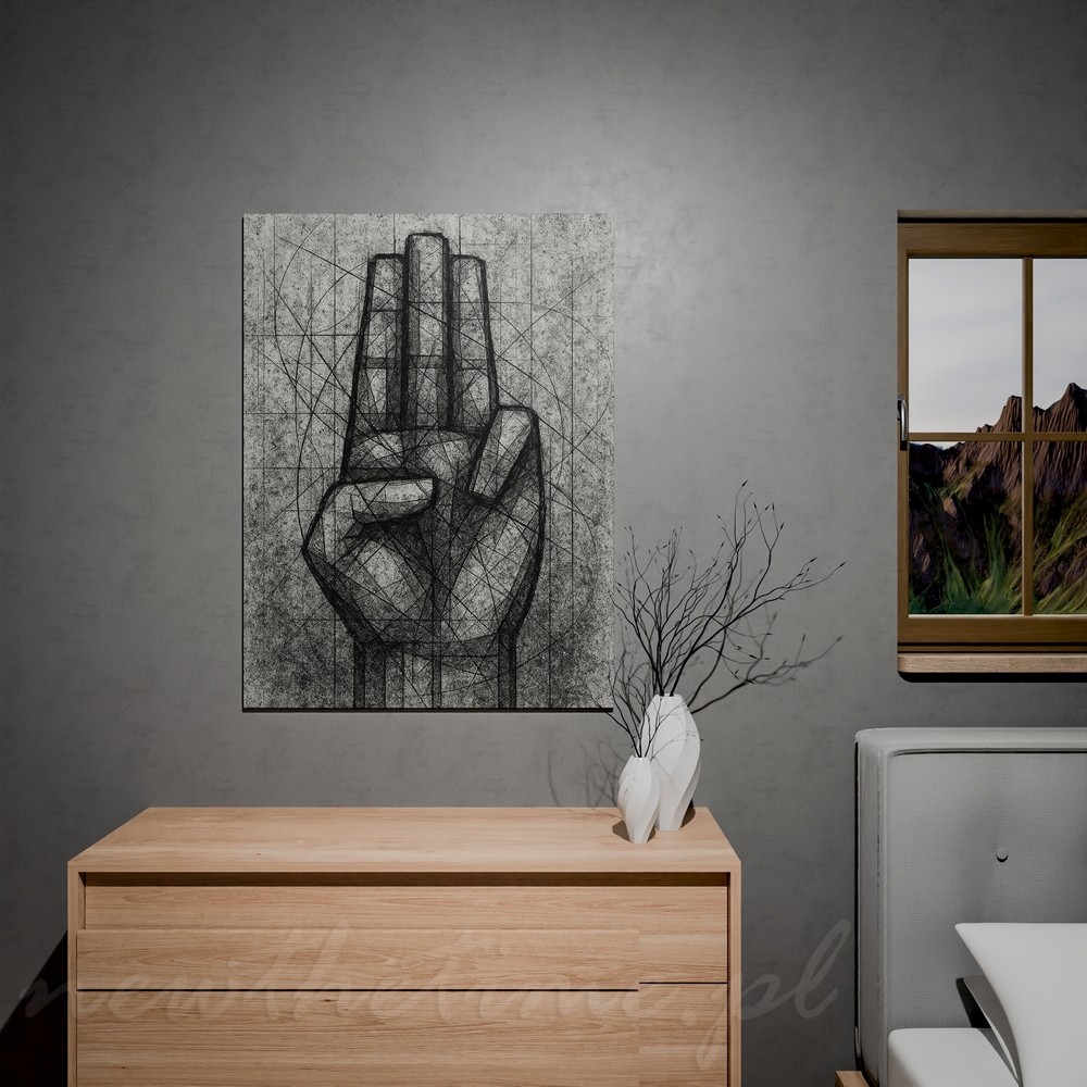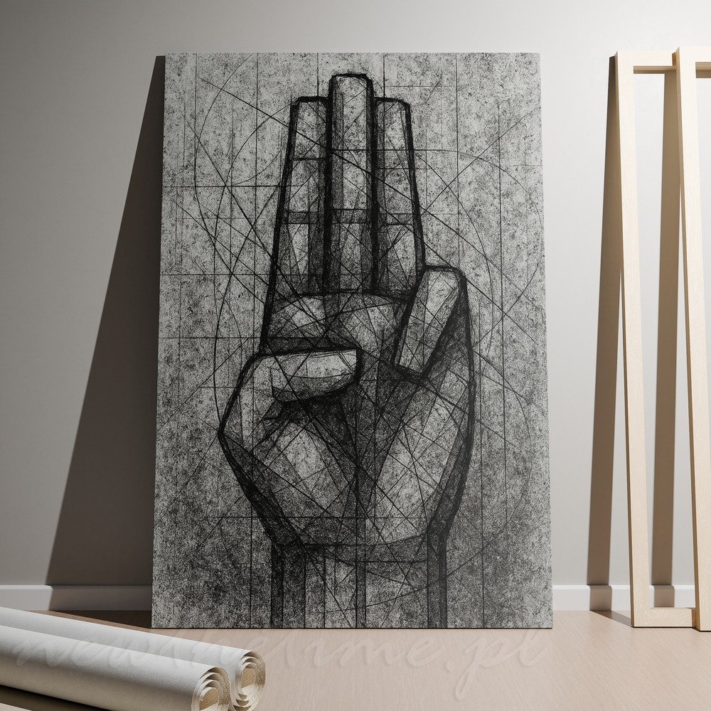 Ten obraz przedstawia stylizowaną dłoń zbudowaną z geometrycznych podziałów i konstrukcyjnych linii przypominających szkic z pracowni artystycznej. Liczne przecinające się linie tworzą wrażenie procesu twórczego – jakby kompozycja powstawała na oczach widza.