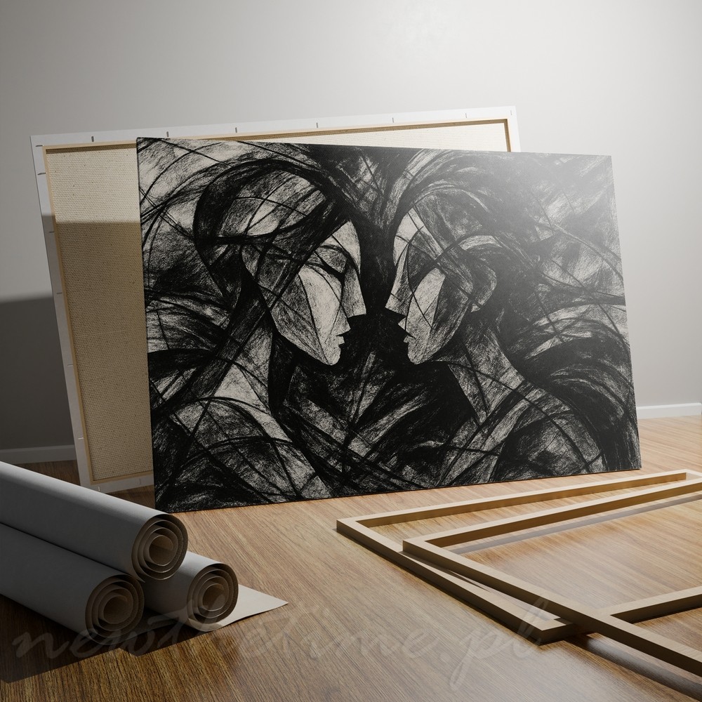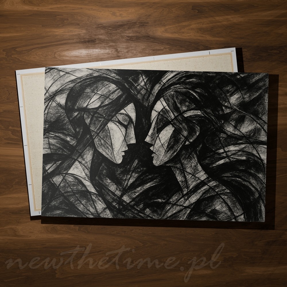 Dwie twarze zwrócone ku sobie – niemal stykają się nosami. Reszta to kontrolowany chaos: agresywne, szerokie pociągnięcia, przecinające się linie, warstwy czerni i szarości. Forma przypomina węgiel na surowym papierze, szkic robiony szybko, intensywnie, bez cofania ręki.