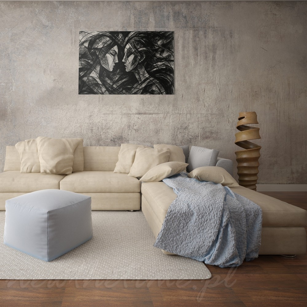 Druk na płótnie canvas oddaje głębię czerni i strukturę „węglowej” faktury. Solidna rama, naciąg gotowy do zawieszenia.