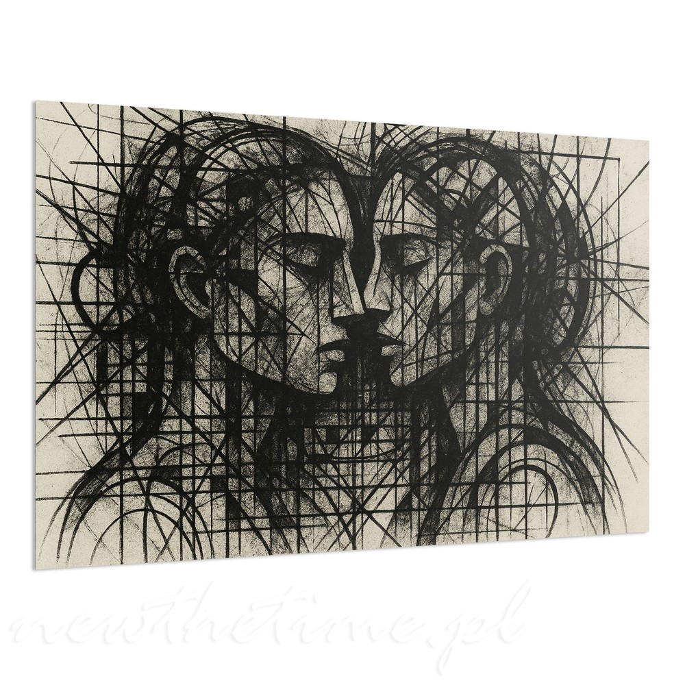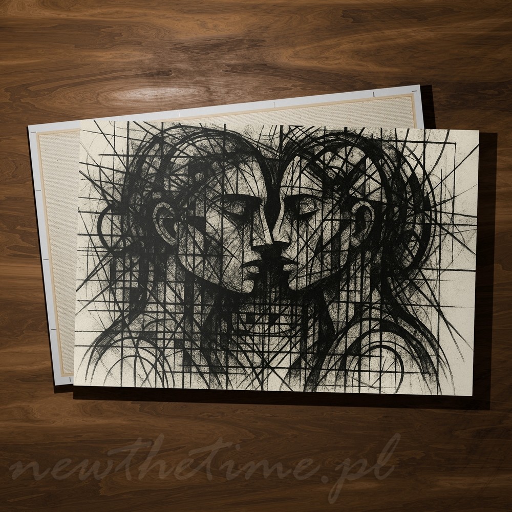 Dwie twarze splecione w jedną formę – symetria, która wygląda jakby była rozrysowana cyrklem, linijką i emocjami. Gęsta siatka linii, szkicowe przetarcia, czarne akcenty i surowe tło tworzą kompozycję balansującą między kubizmem a brutalnym rysunkiem węglem.