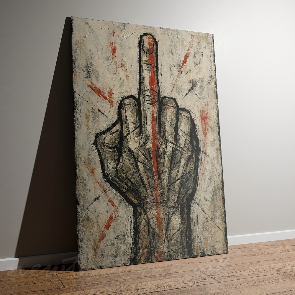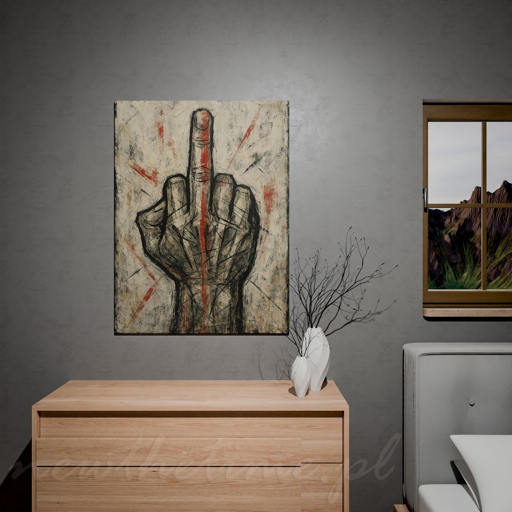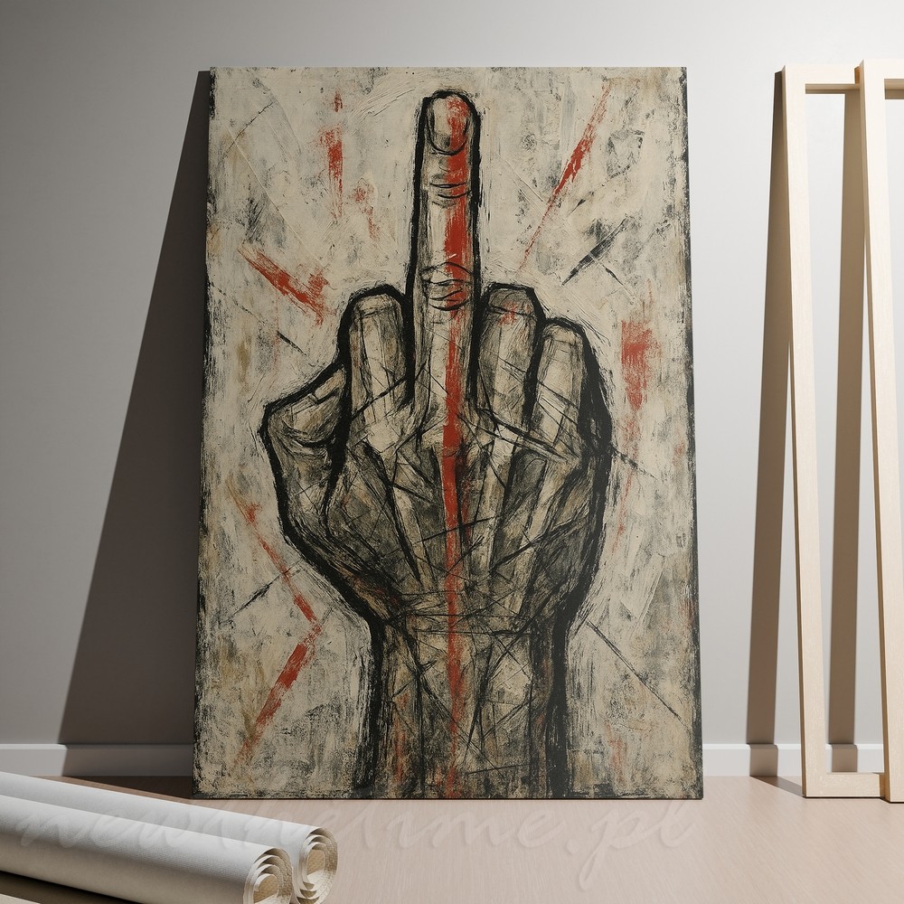 Ten obraz to czysta energia – surowa kreska, przetarta faktura tła i centralny, mocny gest podkreślony pionową smugą czerwieni. Kompozycja wygląda jak połączenie szkicu węglem z malarstwem akrylowym – brudna biel, czarne kontury i agresywne, dynamiczne pociągnięcia pędzla.