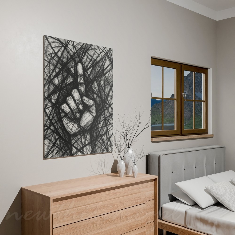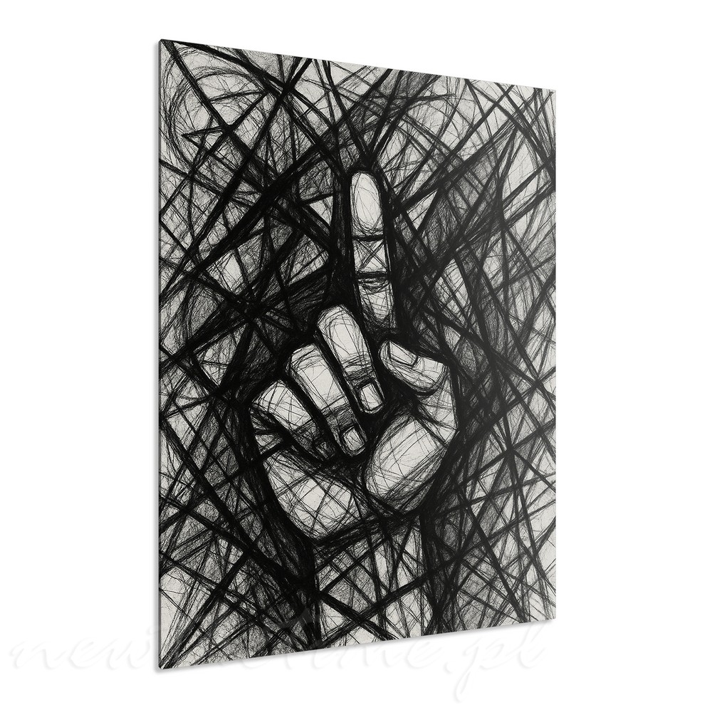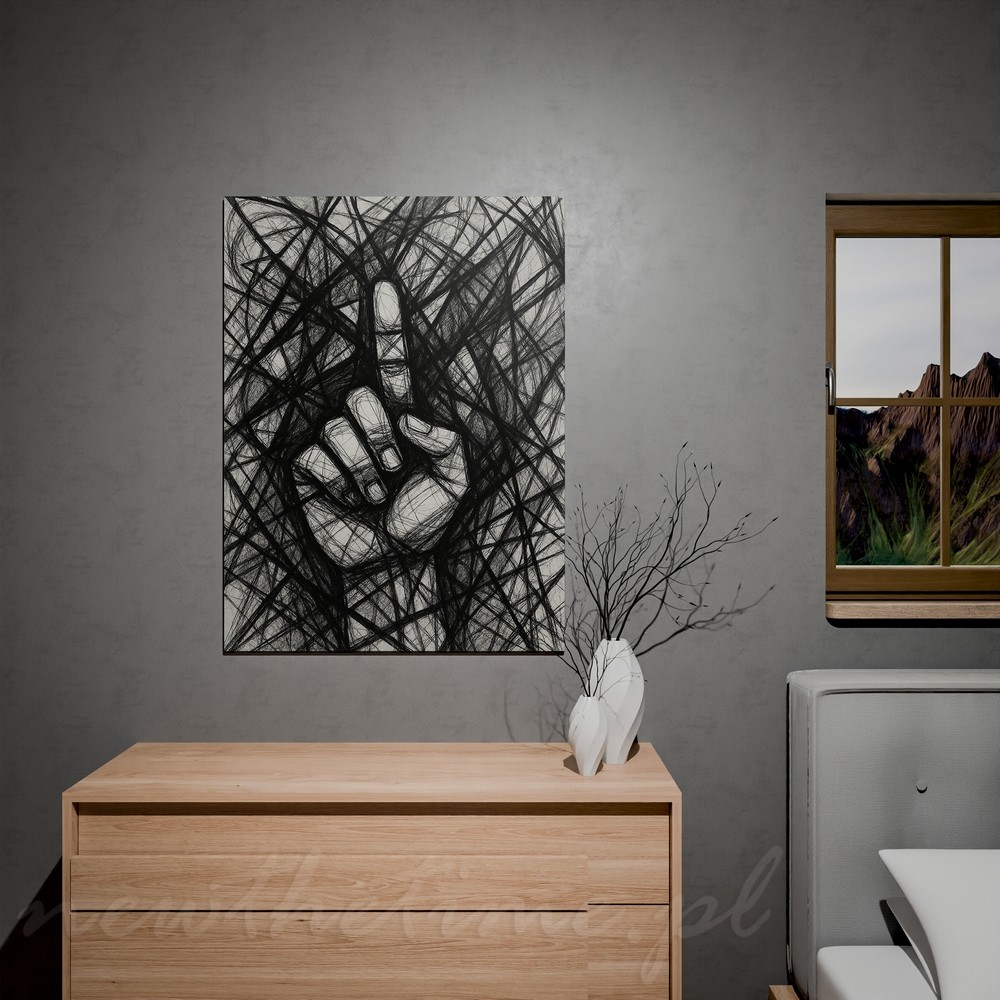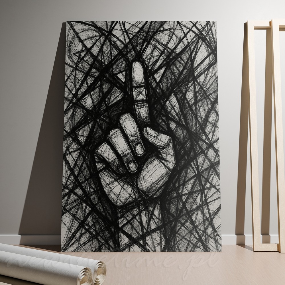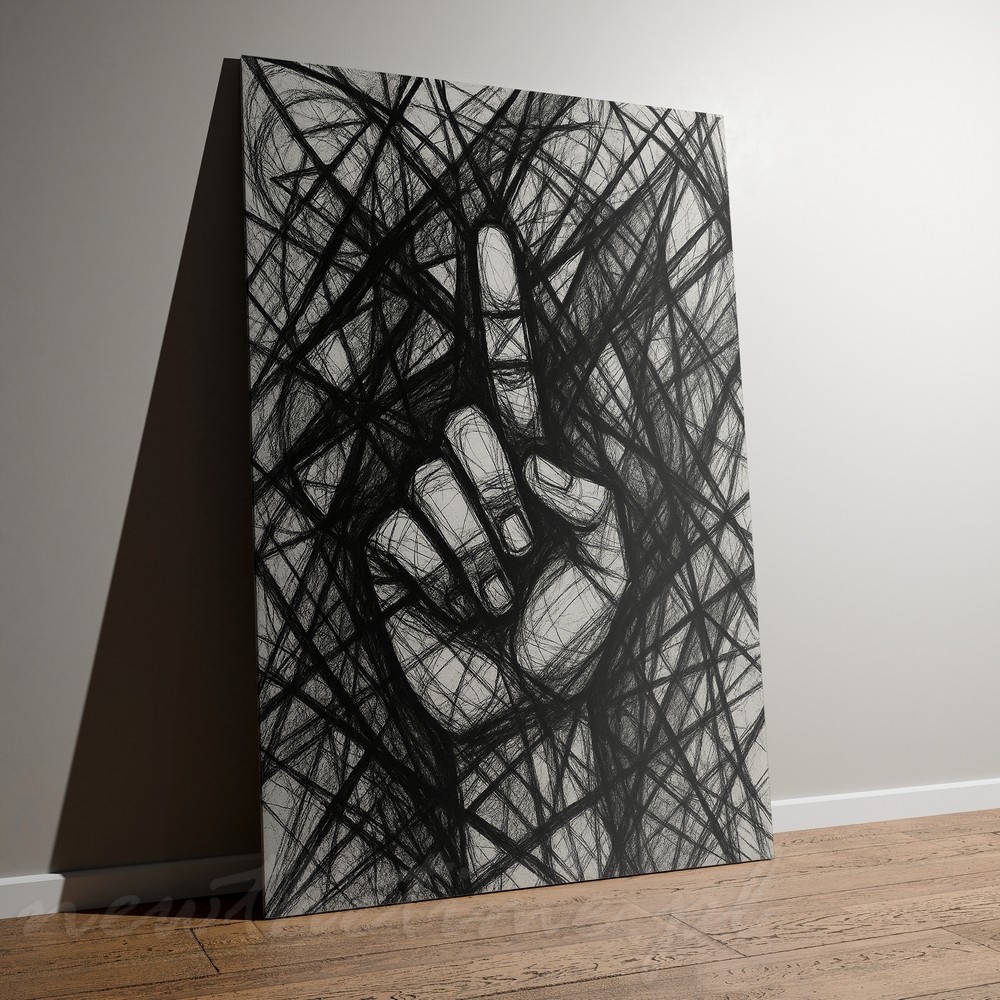 Ta kompozycja to czysta ekspresja – dłoń wyłaniająca się z plątaniny agresywnych, przecinających się linii. Całość przypomina mocny szkic węglem lub tuszem: warstwowy, nerwowy, pełen napięcia. Tło nie jest tłem – jest ruchem, energią, konfliktem form.