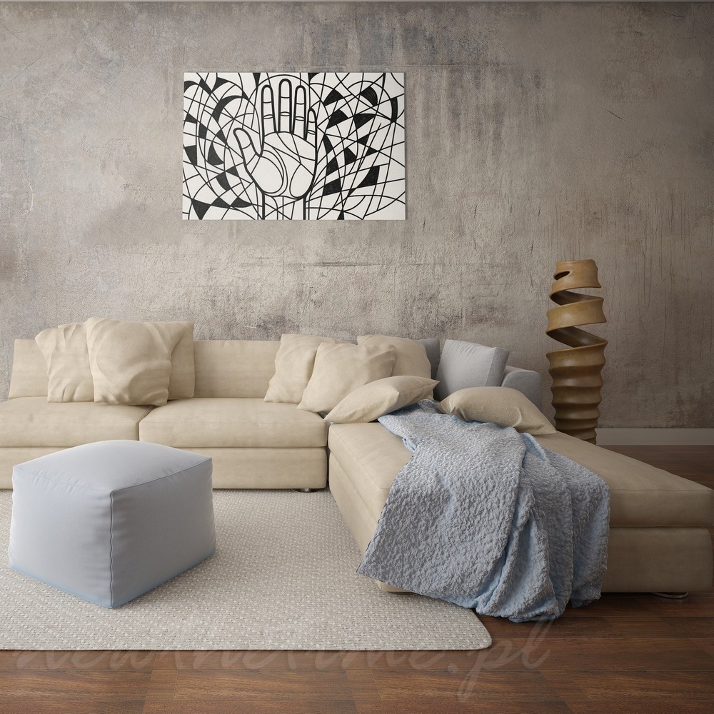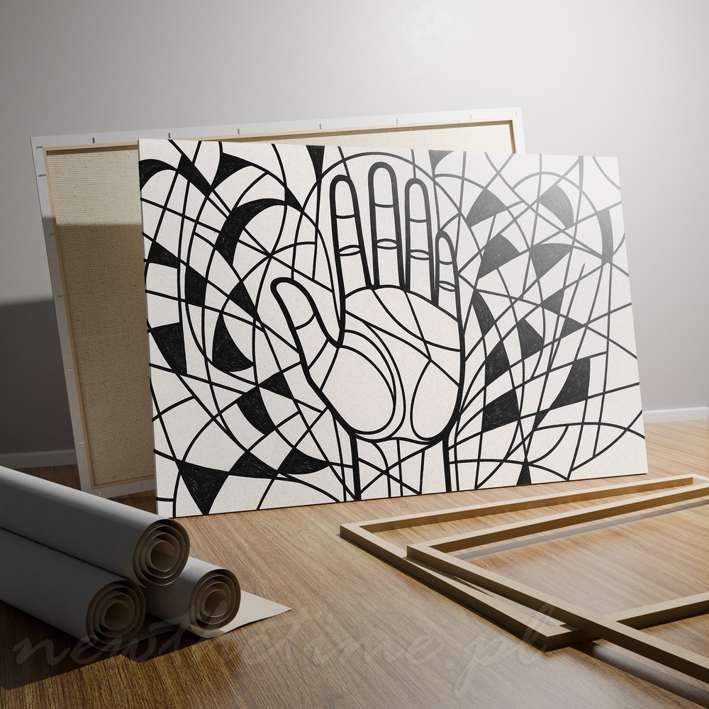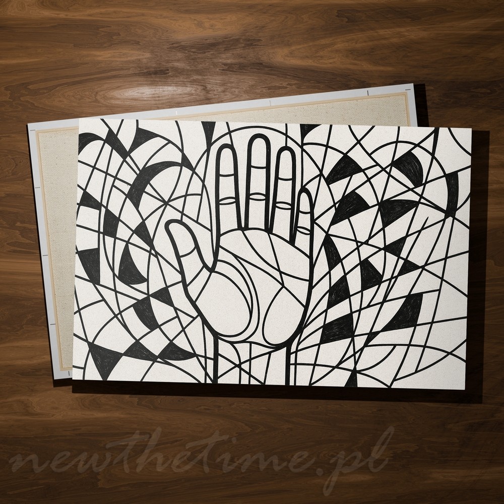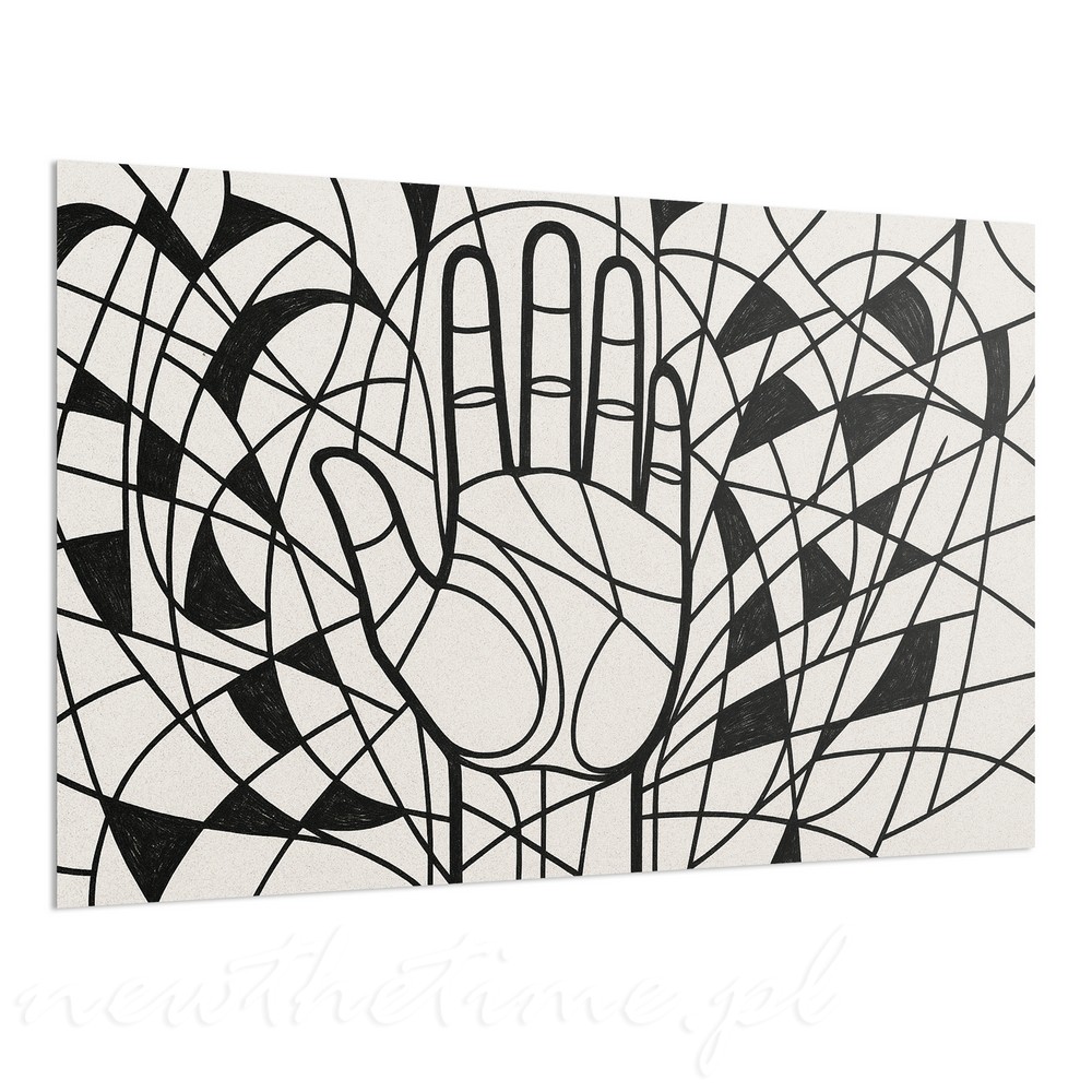 Centralnie umieszczona dłoń otoczona jest gęstą, geometryczną plątaniną linii i półokręgów. Całość oparta wyłącznie na czerni i złamanej bieli, dzięki czemu obraz jest mocny, ale jednocześnie elegancki i graficzny.