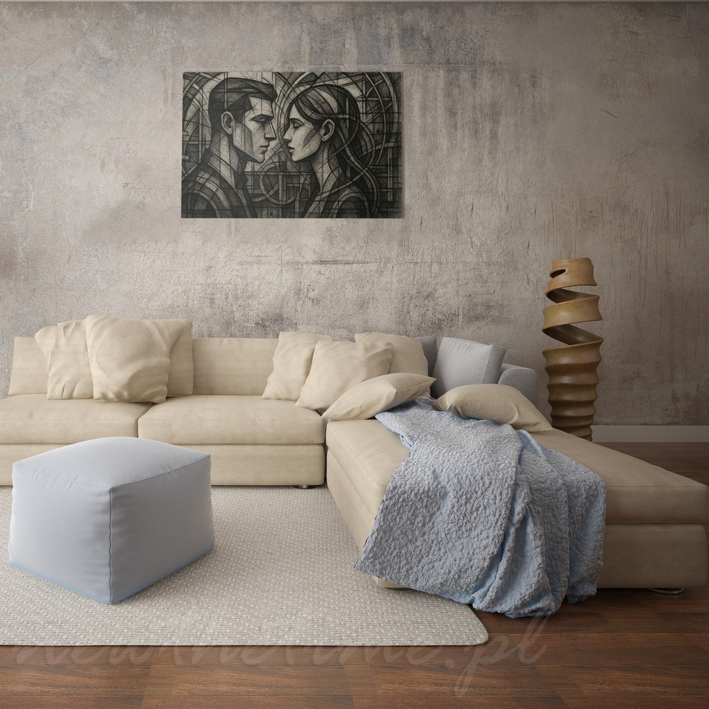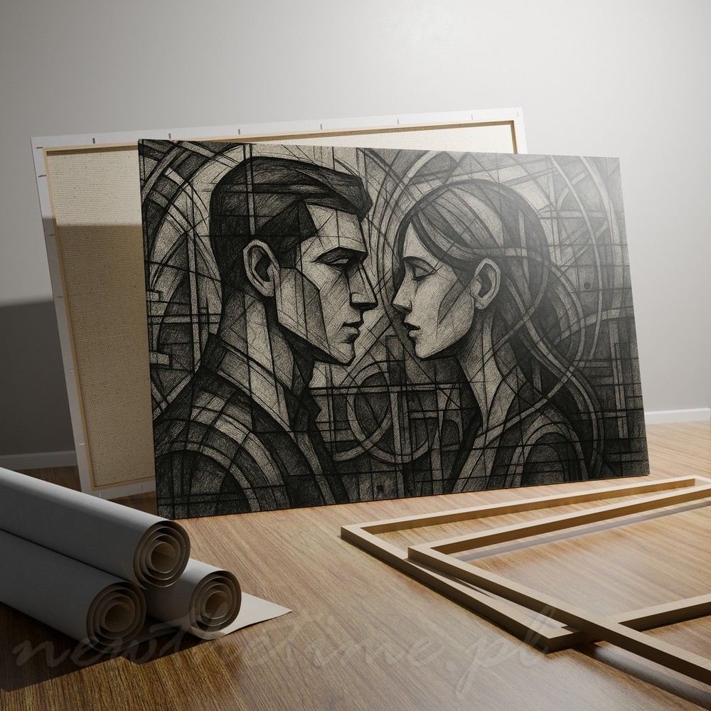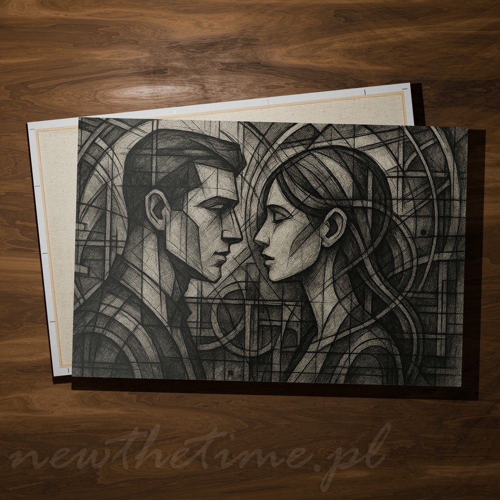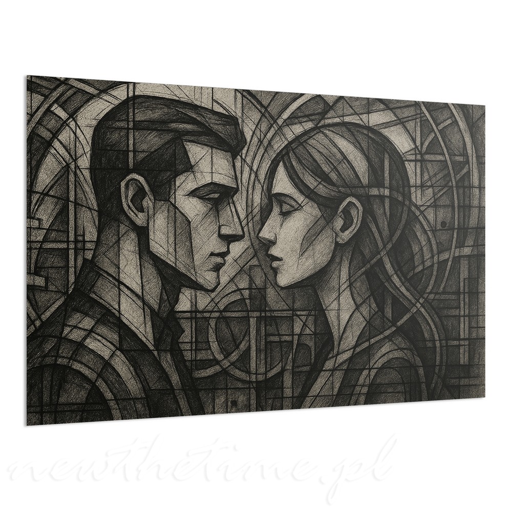 Ten obraz opowiada historię bliskości bez użycia słów. Dwie postacie zwrócone ku sobie, zatrzymane w chwili ciszy i napięcia, tworzą mocny, emocjonalny kadr. Szkicowa kreska połączona z geometrycznymi liniami i łukami nadaje pracy rytm, strukturę i artystyczną głębię.