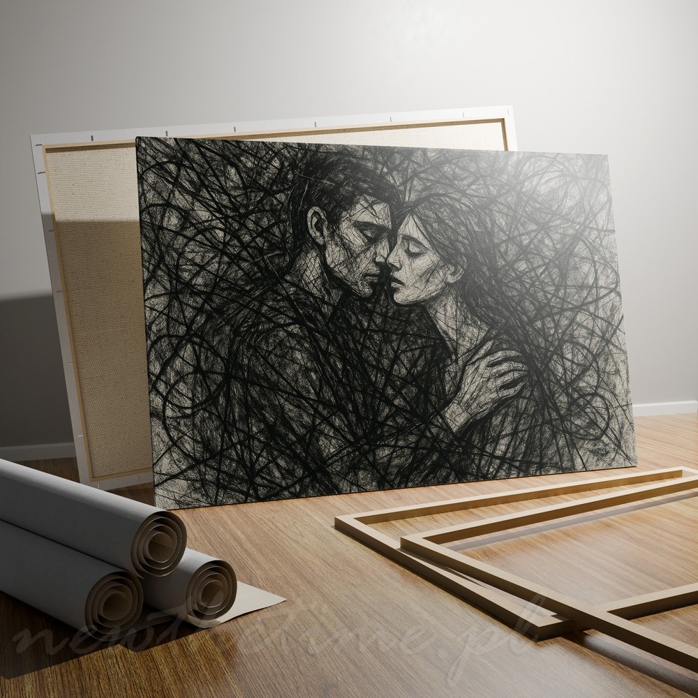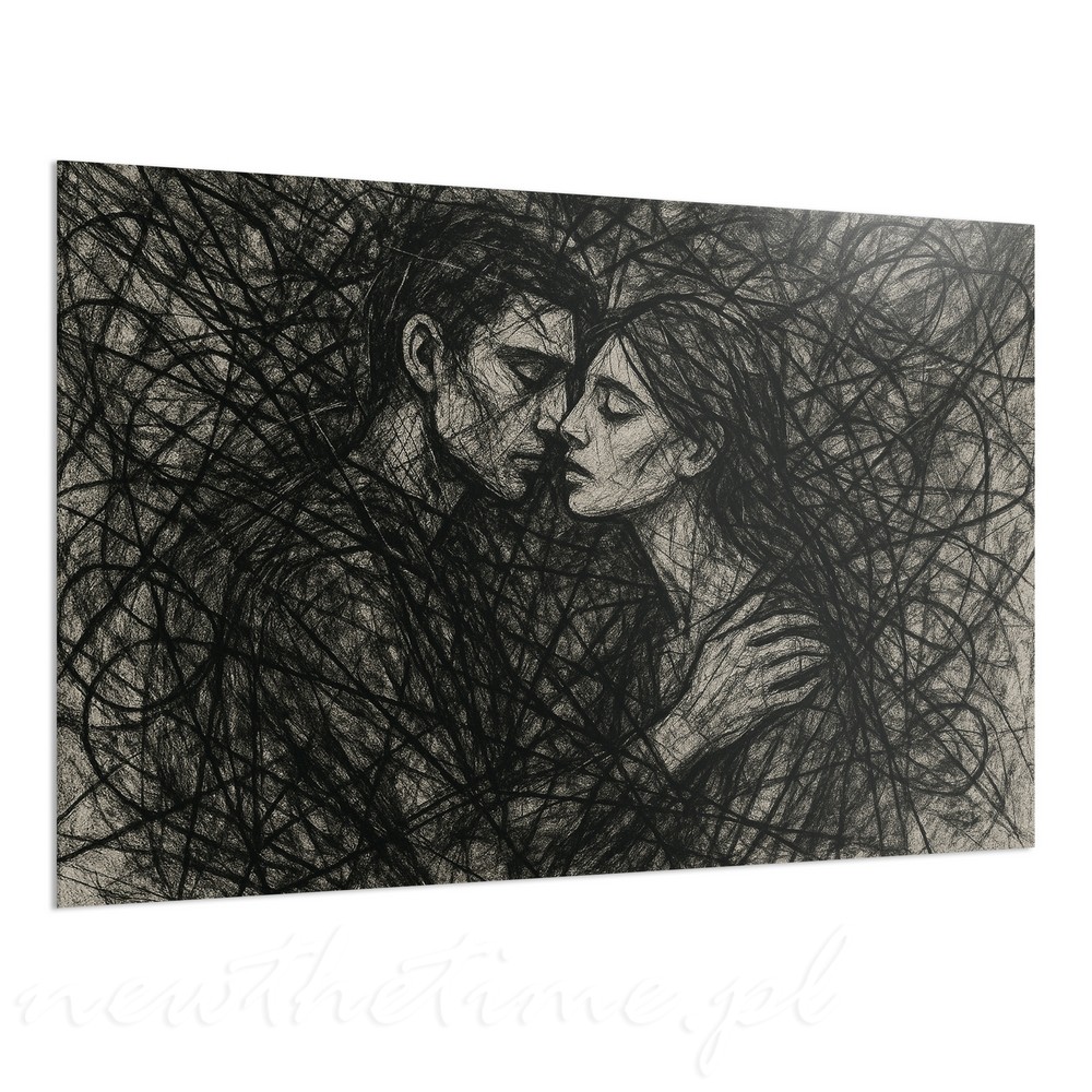 Ten obraz to czysta emocja zamknięta w czerni i bieli. Dwie postacie, blisko siebie, niemal złączone, otoczone gęstą siecią dynamicznych linii. Szkicowa forma, mocne kontrasty i chaotyczna struktura tła budują intensywne napięcie oraz poczucie bliskości, intymności i emocjonalnego splątania.
