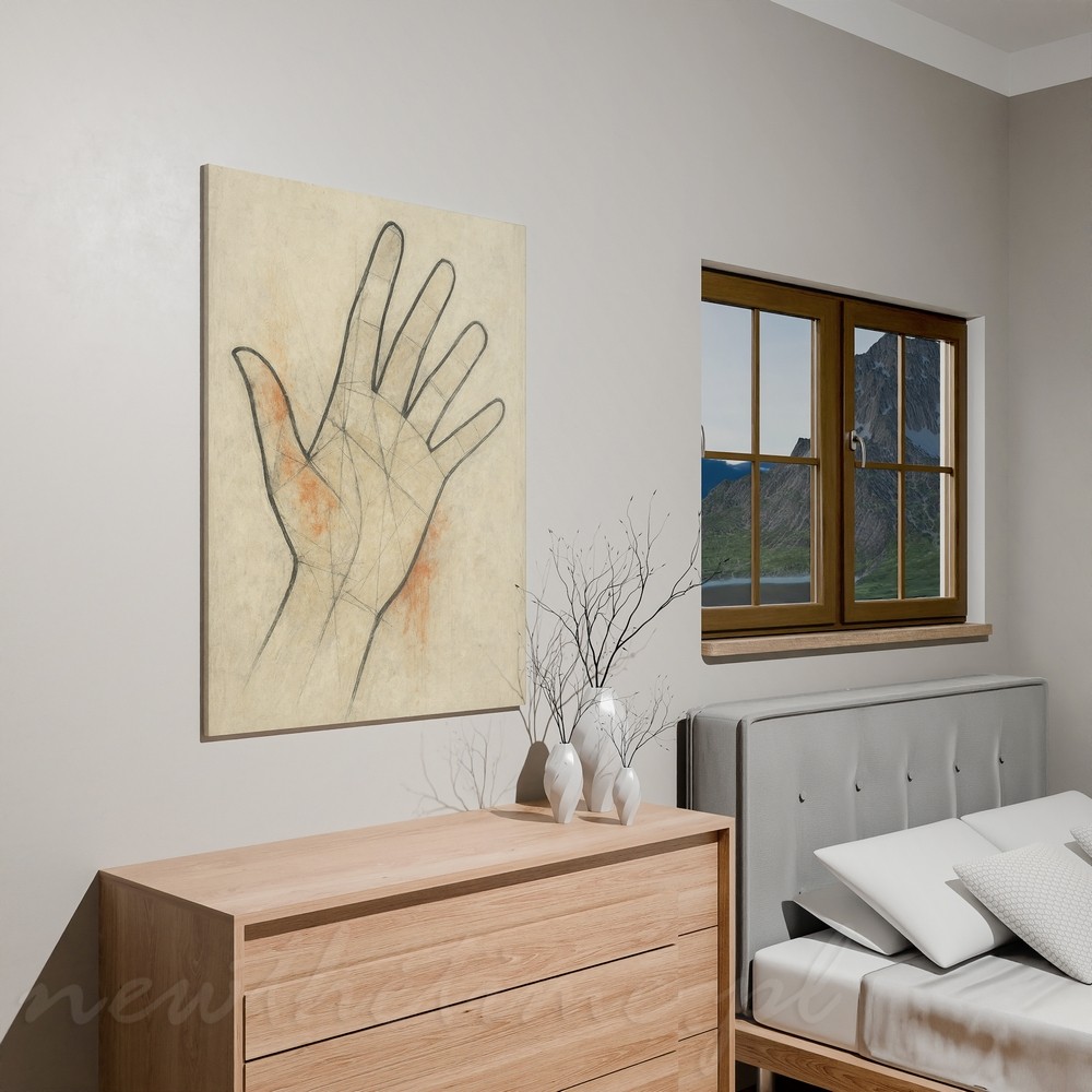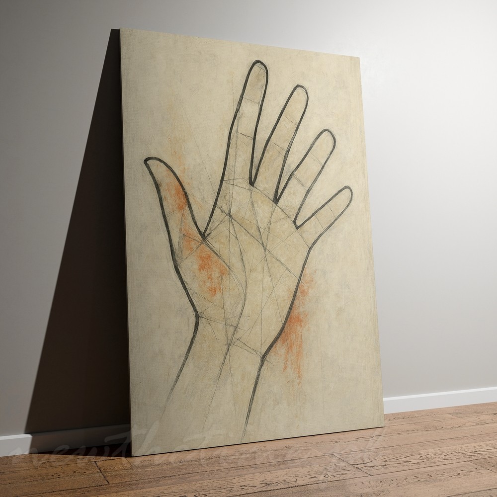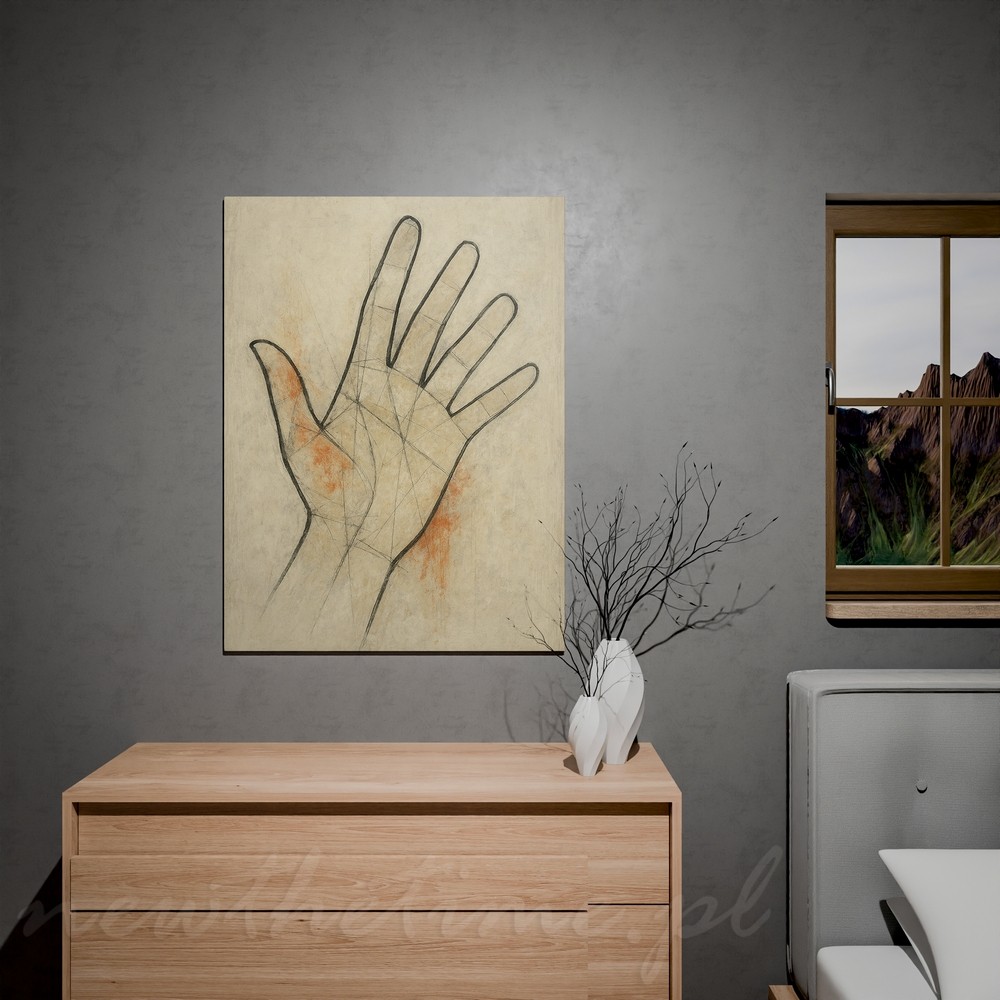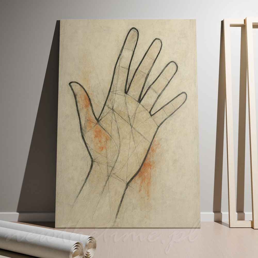 Ten obraz przyciąga uwagę swoją prostotą i spokojem. Motyw dłoni został ukazany w lekkiej, szkicowej formie, z widocznymi liniami konstrukcyjnymi, które nadają całości artystycznej surowości i autentyczności. Jasne, kremowe tło z delikatnymi przetarciami oraz subtelnymi, ciepłymi akcentami kolorystycznymi buduje wrażenie harmonii i przestrzeni.