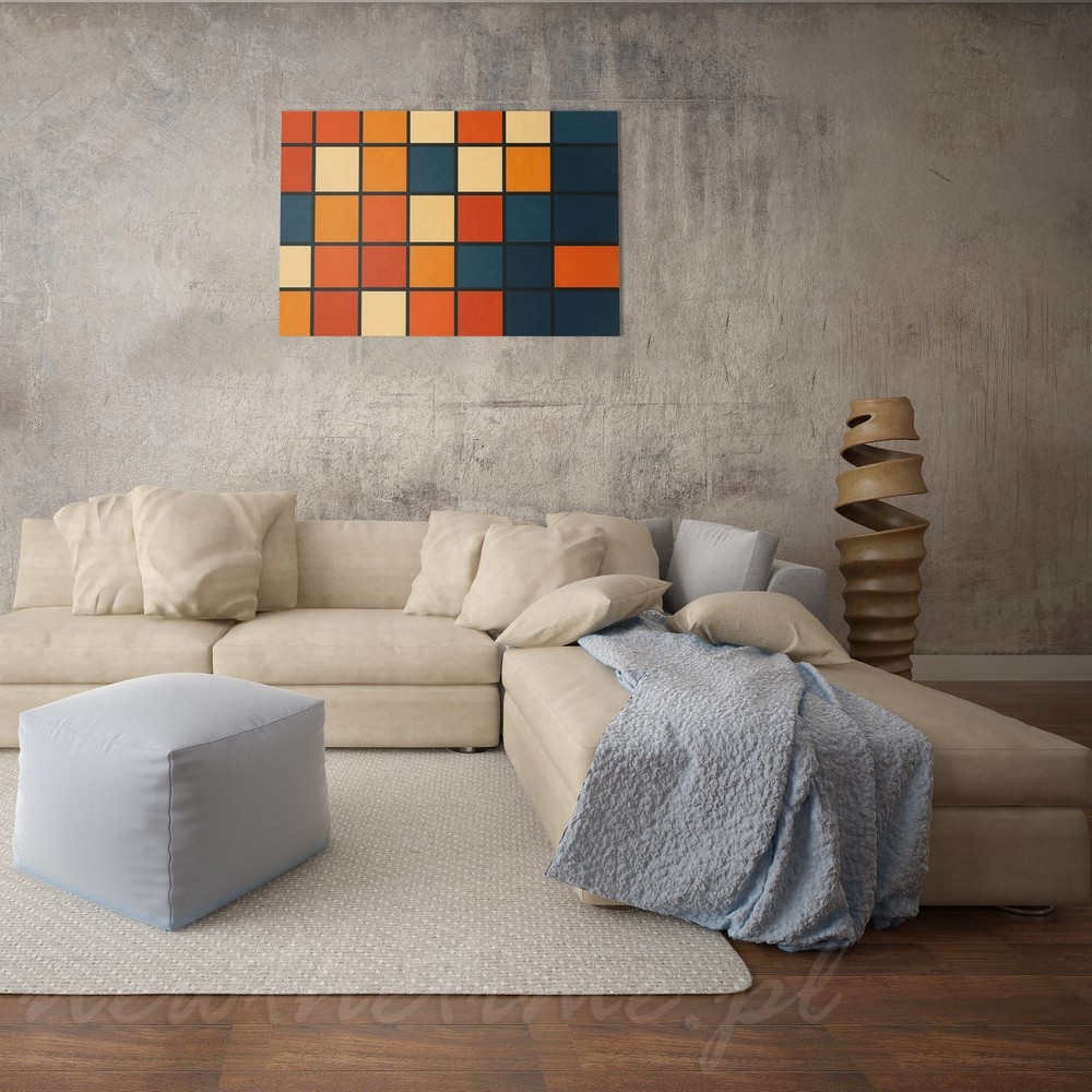 Ten obraz to czysta geometria i kolor. Regularna siatka kwadratów w odcieniach pomarańczy, beżu i głębokiego granatu tworzy rytmiczną, uporządkowaną kompozycję, która wprowadza do wnętrza harmonię i wyrazisty akcent wizualny. Prosty układ i zdecydowane barwy sprawiają, że obraz jest czytelny, ale jednocześnie przyciągający uwagę.