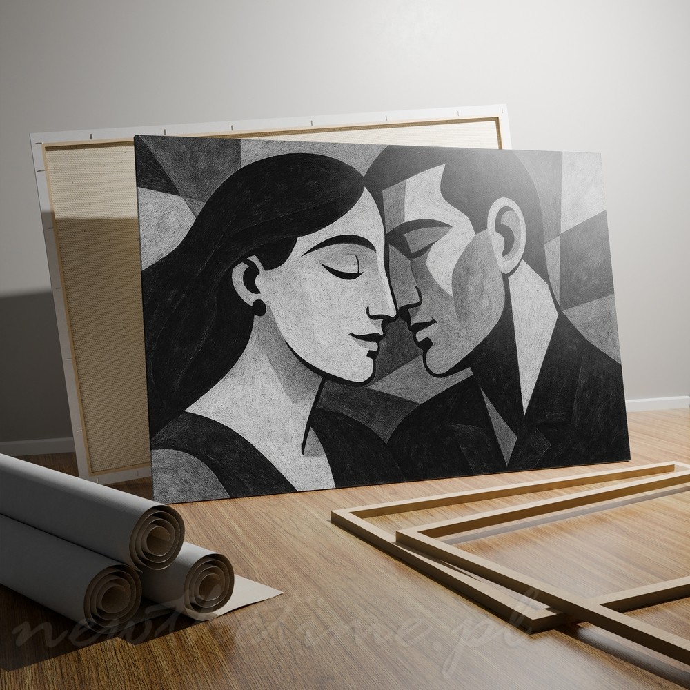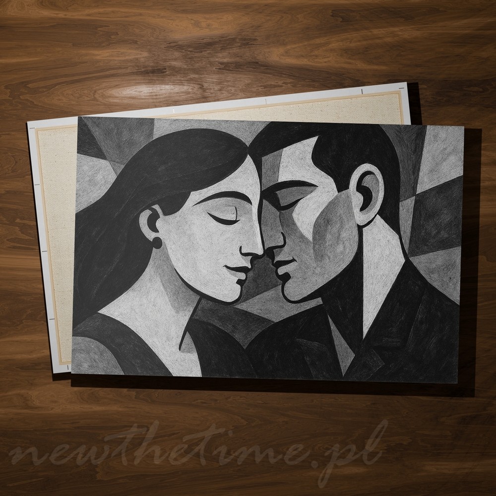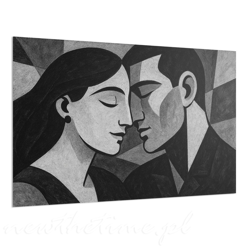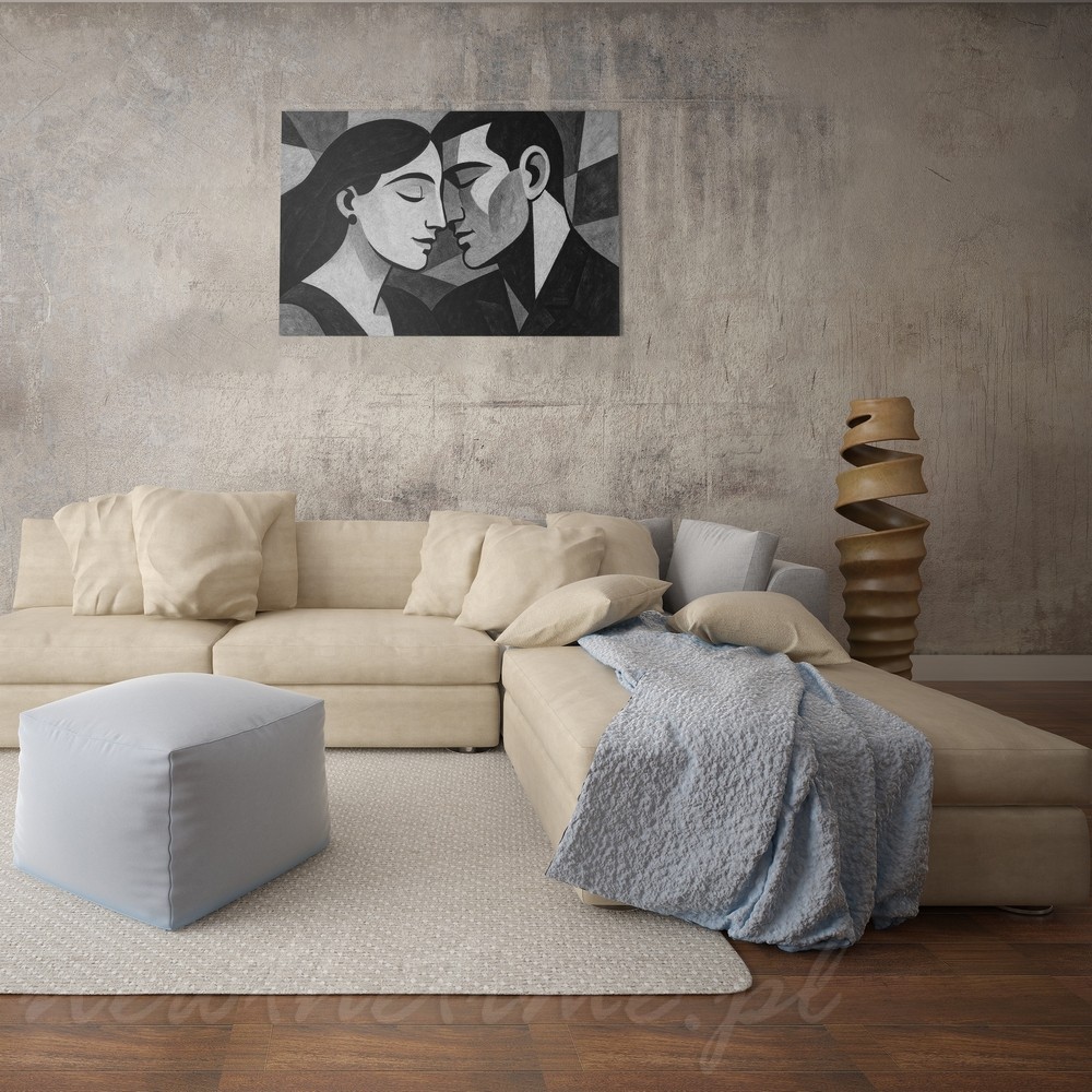 Ten obraz to esencja ciszy, bliskości i emocji zamkniętych w prostej formie. Dwie twarze zwrócone ku sobie, niemal stykające się, budują delikatne napięcie i poczucie intymności. Geometryczne uproszczenia, miękkie przejścia tonalne i harmonijna kompozycja nadają całości elegancji oraz spokoju.