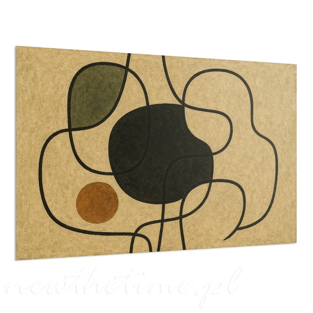 Miękkie, organiczne kształty przeplatają się z cienką, dynamiczną linią, która prowadzi wzrok po całej powierzchni obrazu. Całość jest stonowana, elegancka i bardzo uniwersalna – idealna do wnętrz w stylu japandi, boho, minimalistycznym czy nowoczesnym.