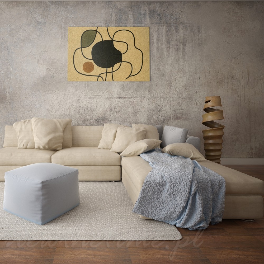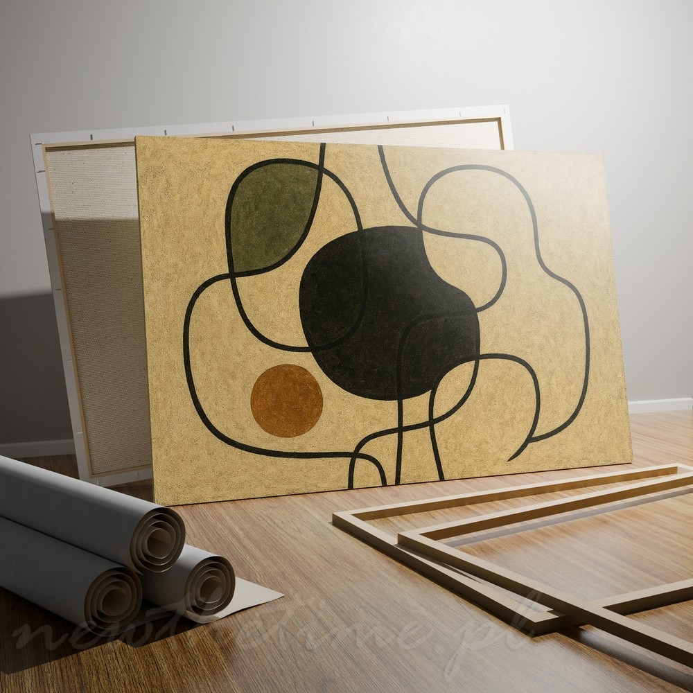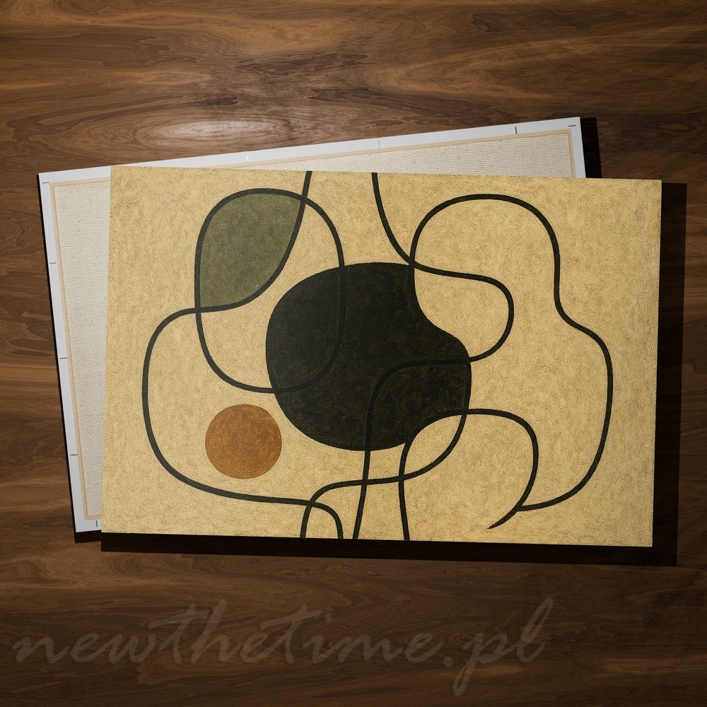 Ten obraz to spokojna abstrakcja oparta na płynnej, swobodnej linii i wyważonych plamach koloru. Centralna, ciemna forma zestawiona z delikatnym beżowym tłem oraz subtelnymi akcentami oliwkowej zieleni i ciepłej ochry tworzy harmonijną, nowoczesną kompozycję.
