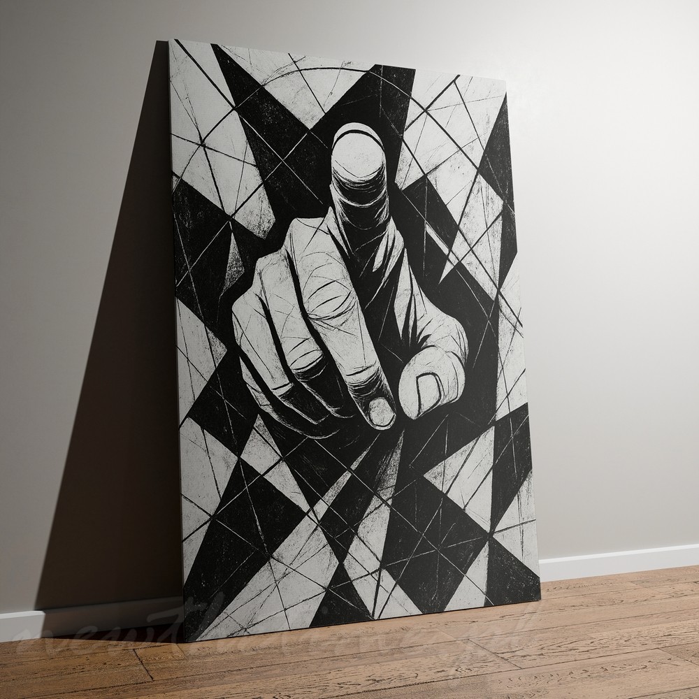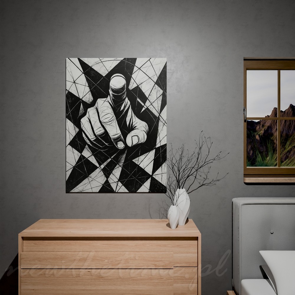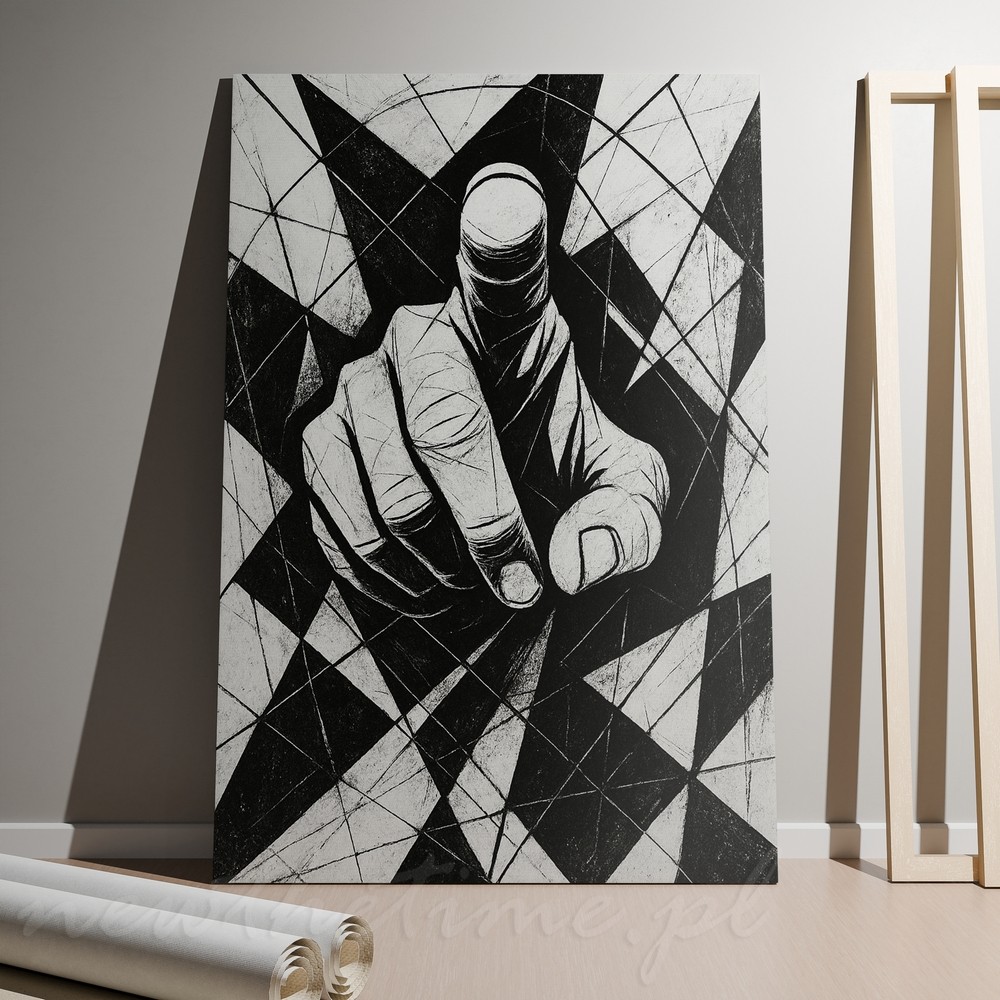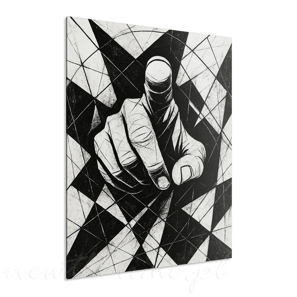 Centralny motyw dłoni wysuniętej do przodu tworzy bezpośredni, niemal konfrontacyjny kontakt z odbiorcą. Silna perspektywa, ostre kontrasty czerni i bieli oraz geometryczne tło pełne przecinających się linii budują napięcie i energię całej kompozycji.