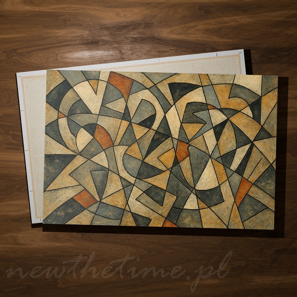Ten obraz to gra kształtów, rytmu i koloru. Abstrakcyjna kompozycja oparta na przenikających się łukach, trójkątach i nieregularnych formach tworzy wrażenie ruchu i głębi. Stonowana paleta barw – beże, ochry, przygaszone błękity i akcenty rdzawej pomarańczy – nadaje całości elegancki, ciepły charakter.