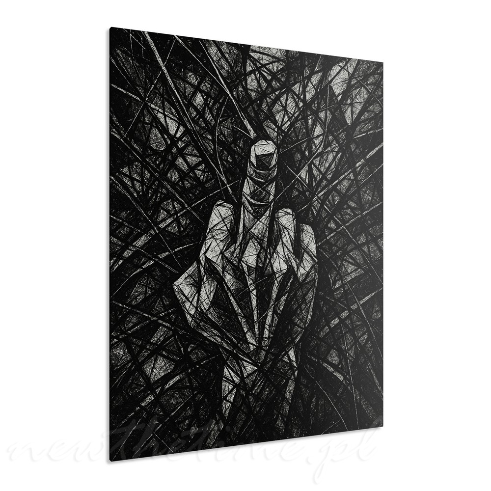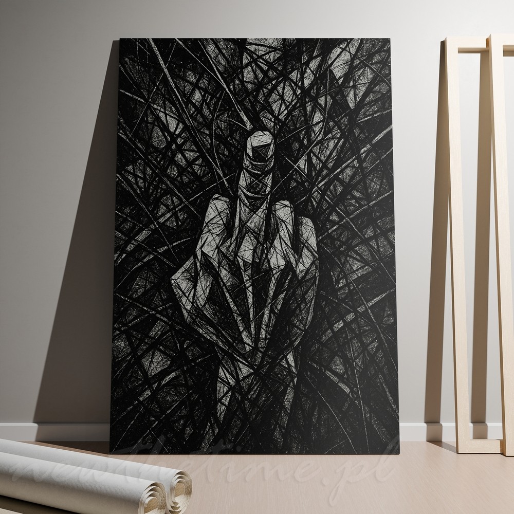 Ten obraz to surowa energia zamknięta w czerni i bieli. Centralna dłoń, zbudowana z ostrych, geometrycznych płaszczyzn, wyłania się z gęstej, chaotycznej sieci linii. Tło tworzy dynamiczną strukturę przypominającą splątane szkice, pęknięcia lub graficzną eksplozję – całość buduje mocne napięcie i głębię.