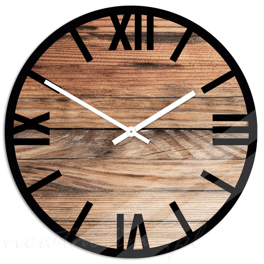 Nowoczesny zegar ścienny Modern Wood, wykonany z wysokiej jakości materiałów z nadrukiem wykonany nowoczesną technologią zadruku na szkle. Motyw drewna w połączeniu z czarnymi elementami jest ciekawym rozwiązaniem do nowoczesnych wnętrz.
