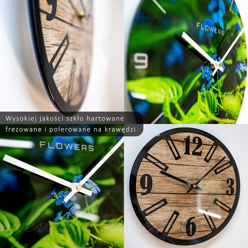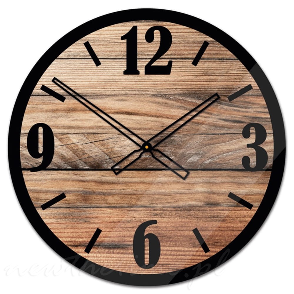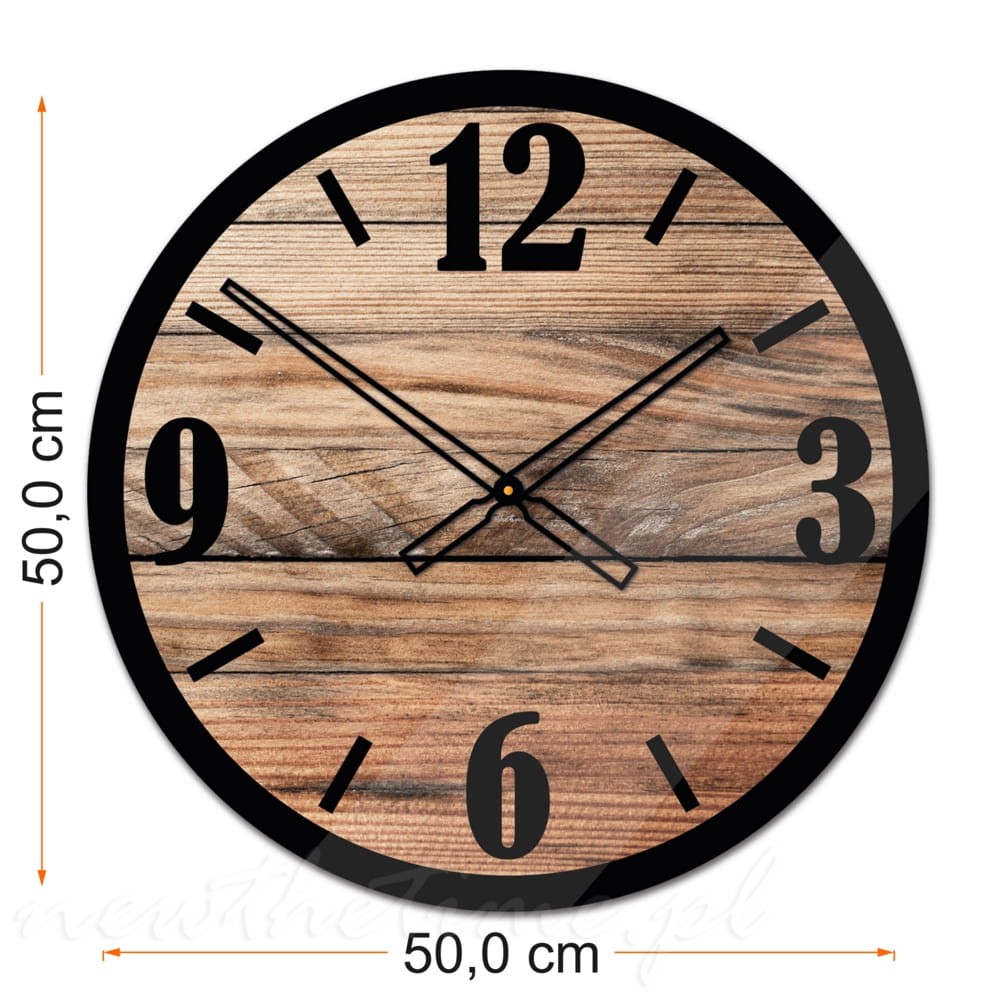 Szklany zegar ścienny MW X6 - motyw drewna, cyfry, indeksy czarne 50 cm