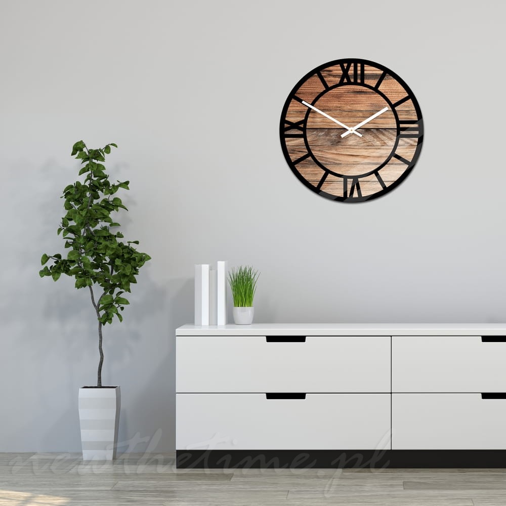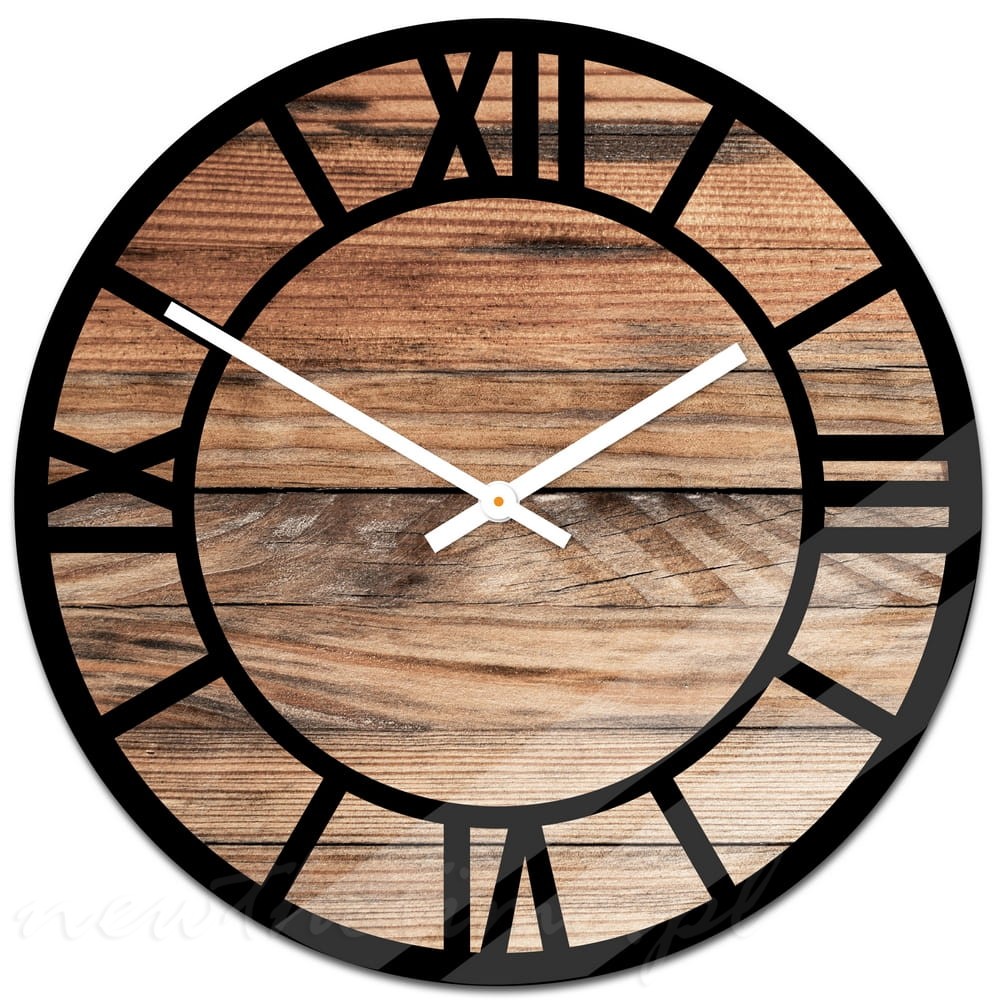 Nowoczesny zegar ścienny Modern Wood, wykonany z wysokiej jakości materiałów z nadrukiem wykonany nowoczesną technologią zadruku na szkle. Motyw drewna w połączeniu z czarnymi elementami jest ciekawym rozwiązaniem do nowoczesnych wnętrz.