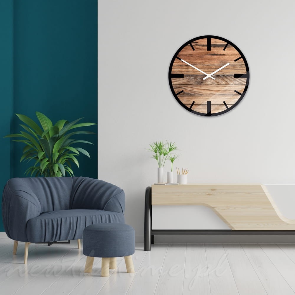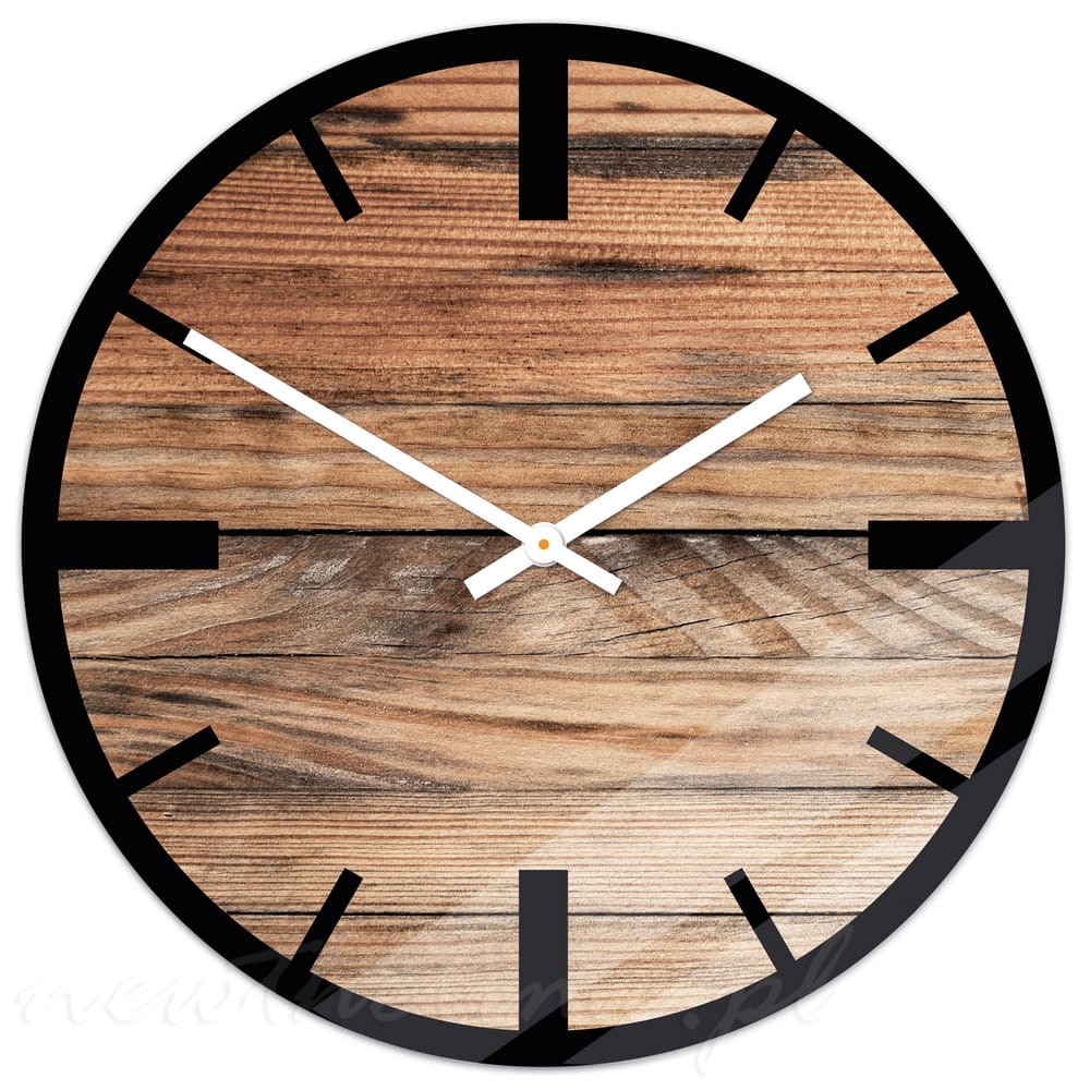 Nowoczesny zegar ścienny Modern Wood, wykonany z wysokiej jakości materiałów z nadrukiem wykonany nowoczesną technologią zadruku na szkle. Motyw drewna w połączeniu z czarnymi elementami jest ciekawym rozwiązaniem do nowoczesnych wnętrz.