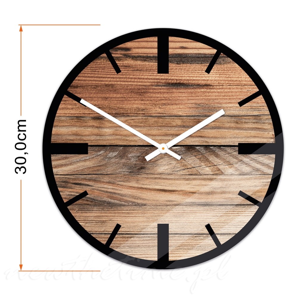 Szklany zegar ścienny Modern Wood X12 - z motywem drewna, czarne indeksy 30cm