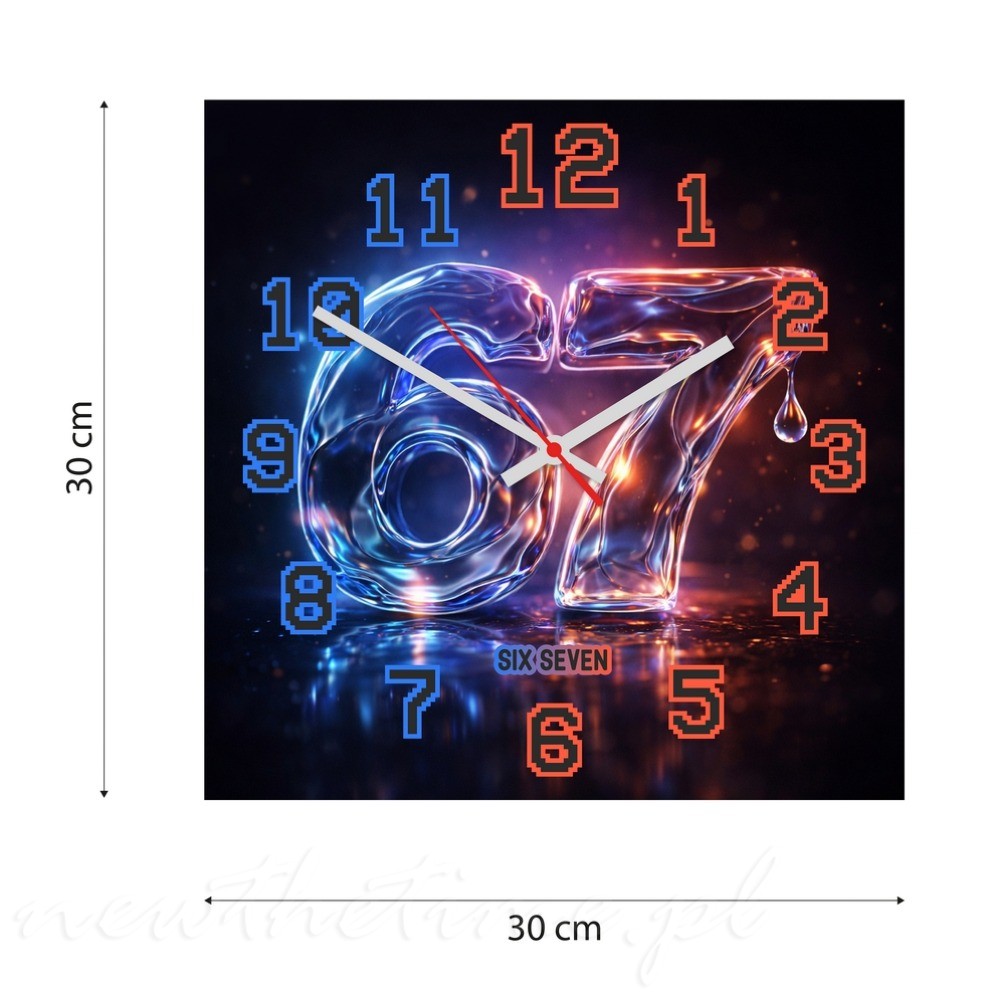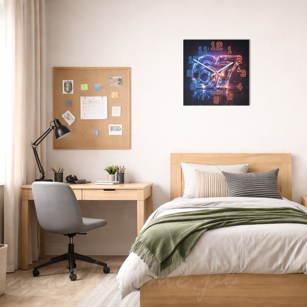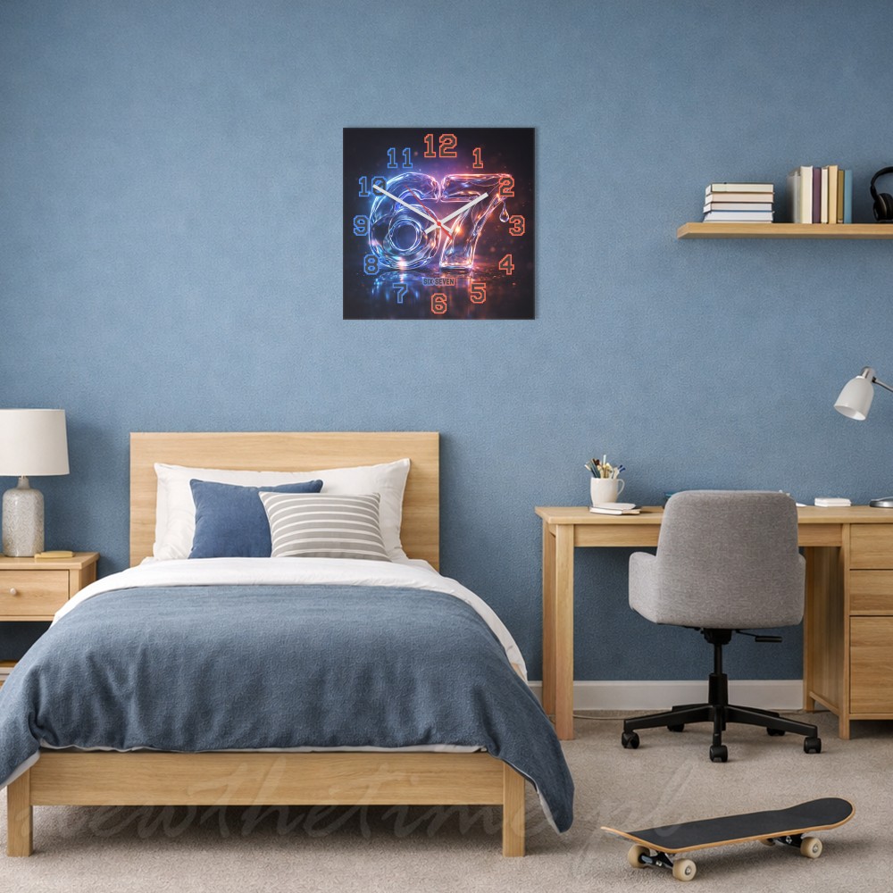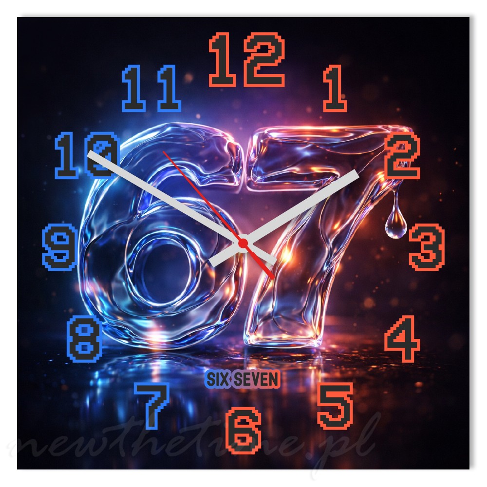 Motyw „67” przedstawiony jest w stylu płynnego szkła (liquid glass), z efektami połysku i neonowego światła. Całość tworzy nowoczesny, designerski wygląd, który świetnie pasuje do wnętrz w stylu futurystycznym, gamingowym lub minimalistycznym.