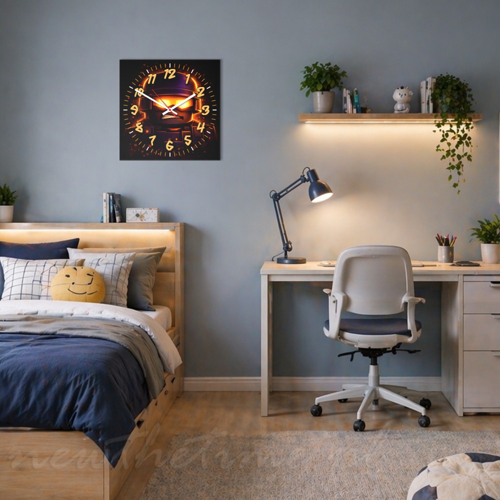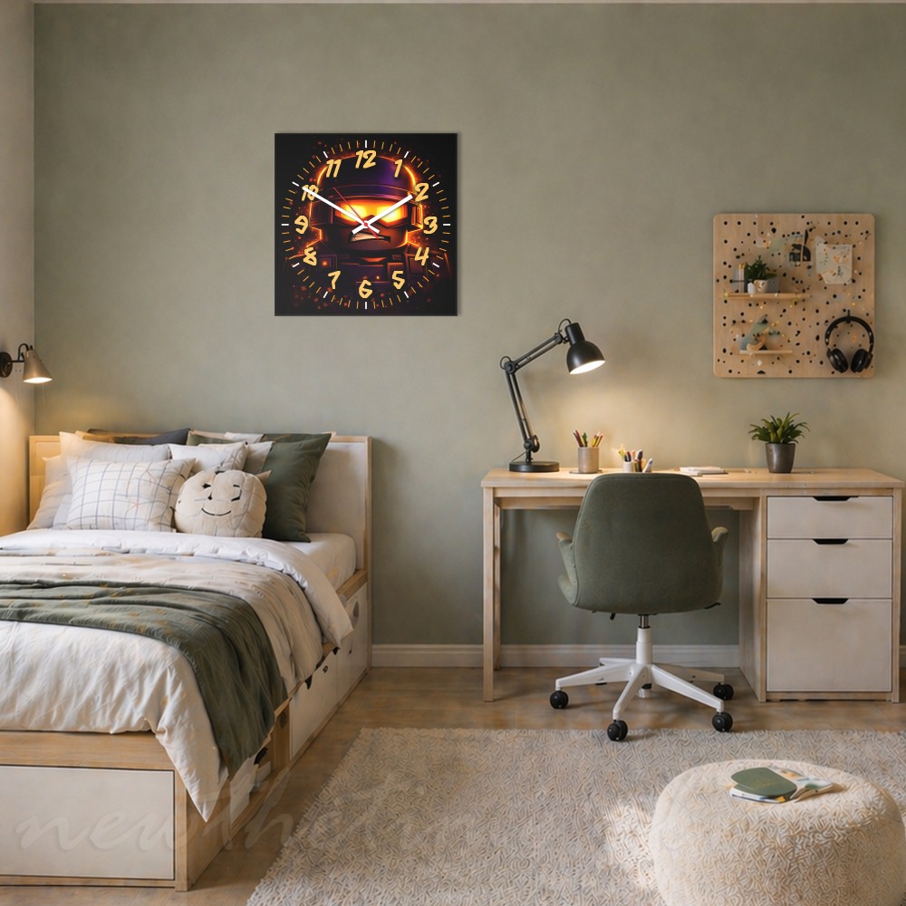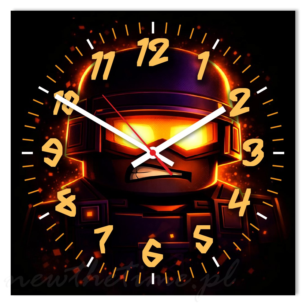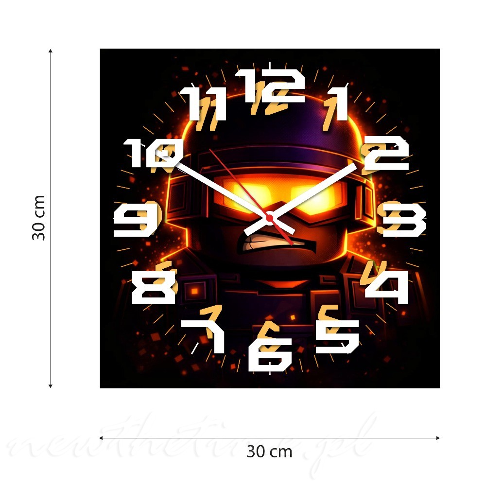 Zegar ścienny żołnierz ogień gaming 30x30 cm to nowoczesny zegar młodzieżowy wykonany z trwałej i lekkiej płyty PVC o grubości 3 mm.