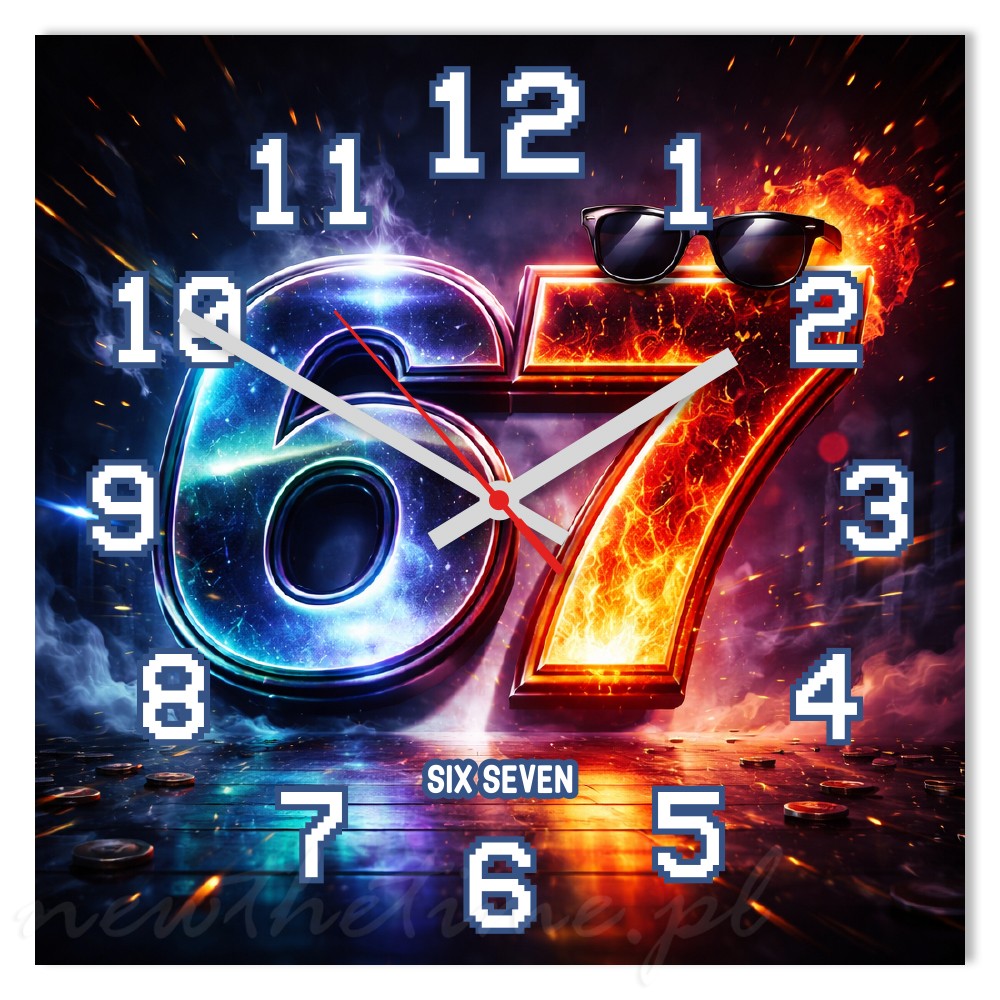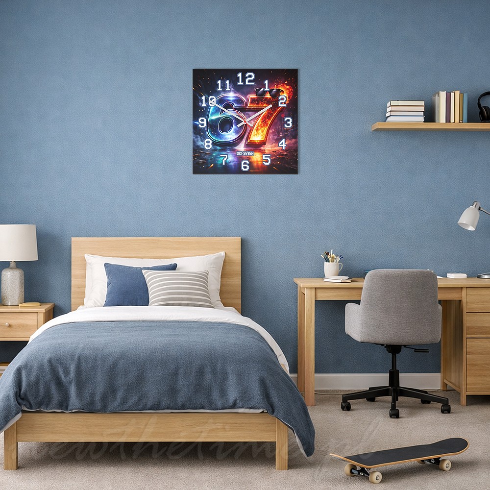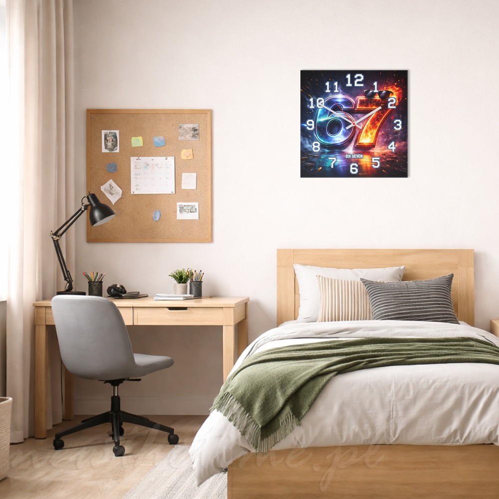 Wyrazisty motyw „67” w połączeniu z efektem ognia i lodu tworzy silny kontrast kolorystyczny – niebieskie i czerwone elementy nadają wnętrzu energii i nowoczesnego charakteru. Neonowy styl sprawia, że zegar świetnie wpisuje się w klimat pokoju nastolatka, gracza lub nowoczesnego wnętrza.