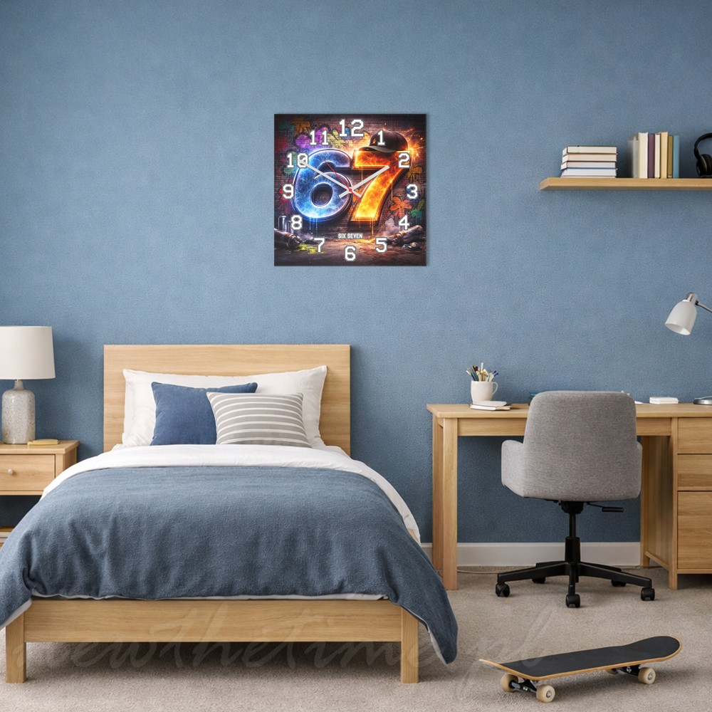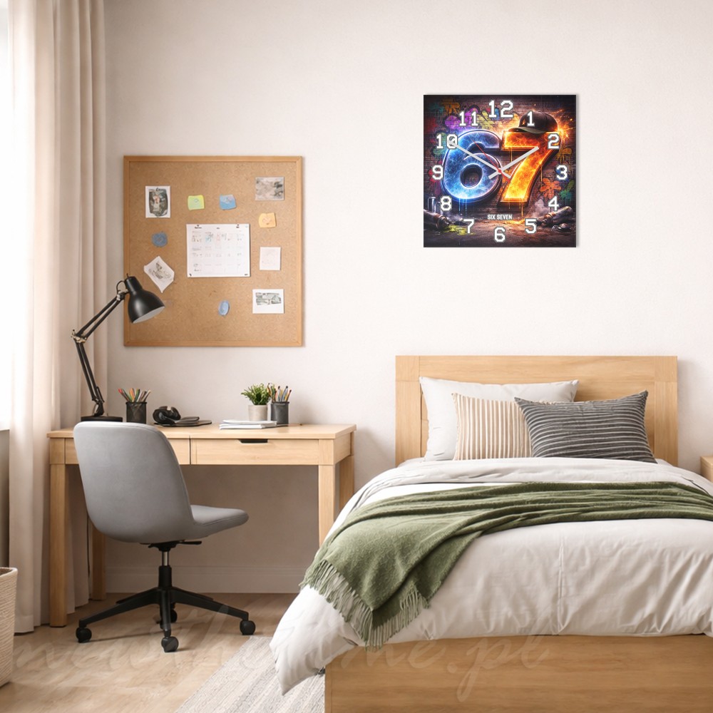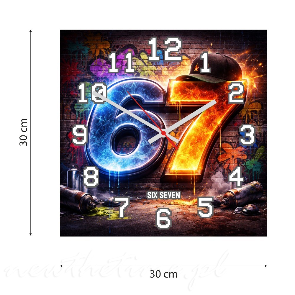Wykonany z trwałej płyty PVC 3 mm, łączy lekkość z wysoką estetyką. Motyw „67” został przedstawiony na tle graffiti z dodatkiem ognia i elementów streetwear, co nadaje zegarowi dynamiczny i wyrazisty charakter.