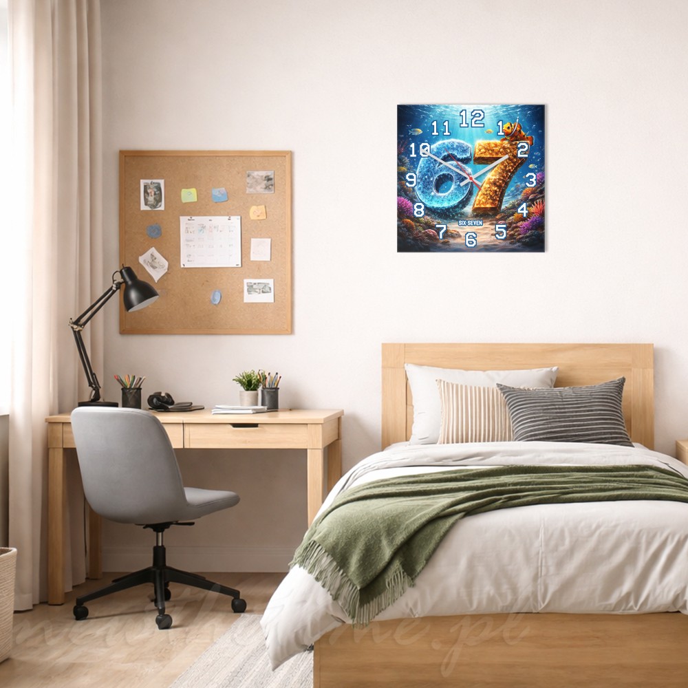 Grafika inspirowana podwodnym światem przedstawia motyw „67” w otoczeniu oceanu, raf koralowych i ryb. Dominujące odcienie niebieskiego i turkusu wprowadzają do wnętrza świeżość i spokój, jednocześnie zachowując nowoczesny, młodzieżowy styl.