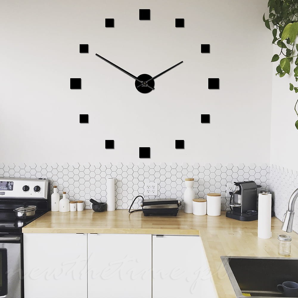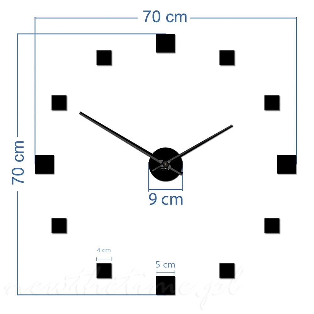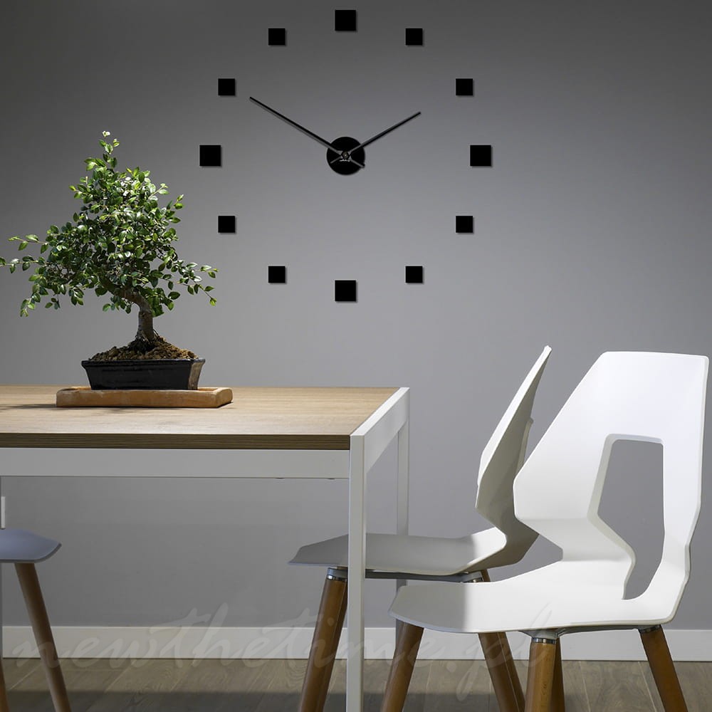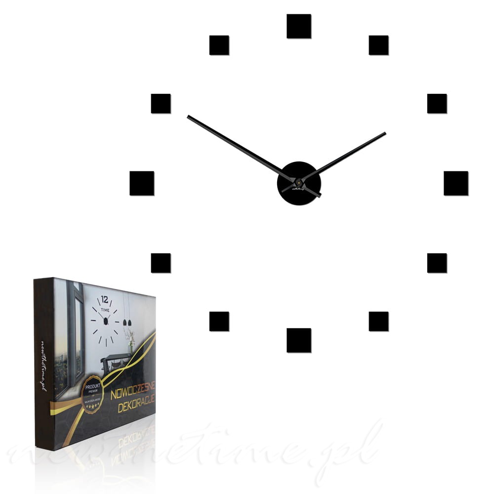 Zegar na ścianę składa się z czterech większych kwadratów wyznaczających główne godziny, a także z pozostałych ośmiu mniejszych.
