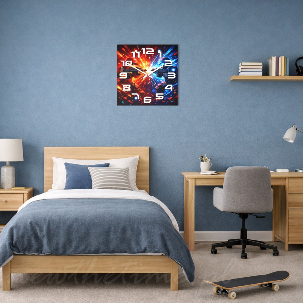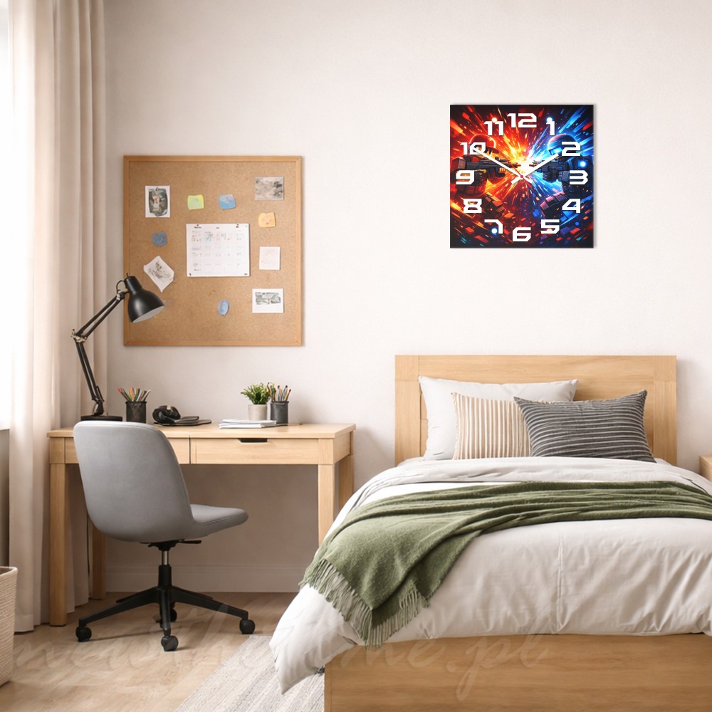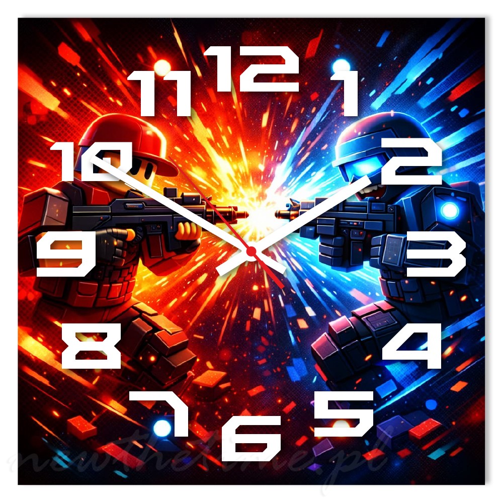 Zegar ścienny gaming vs walka 30x30 cm to nowoczesny zegar młodzieżowy wykonany z trwałej płyty PVC o grubości 3 mm.