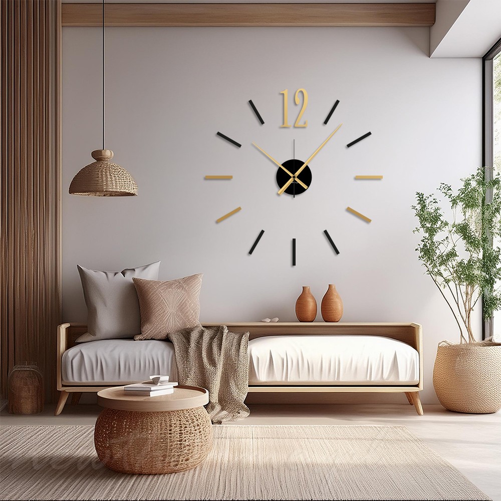 Minimalistyczne indeksy godzinowe oraz złote wskazówki tworzą elegancki kontrast, dzięki czemu zegar doskonale pasuje do wnętrz w stylu nowoczesnym, loftowym, skandynawskim czy glamour.