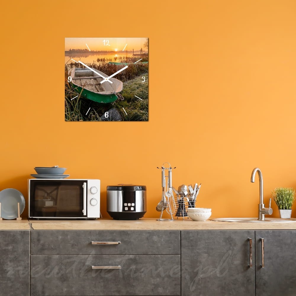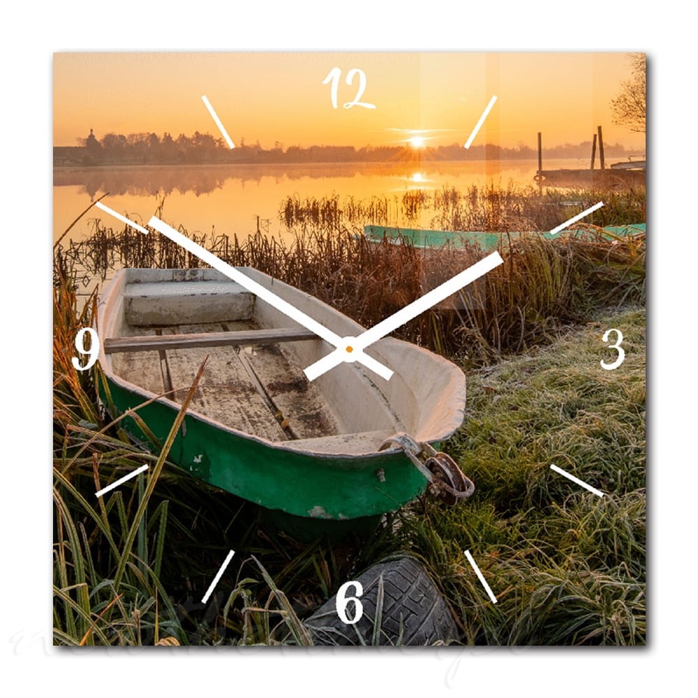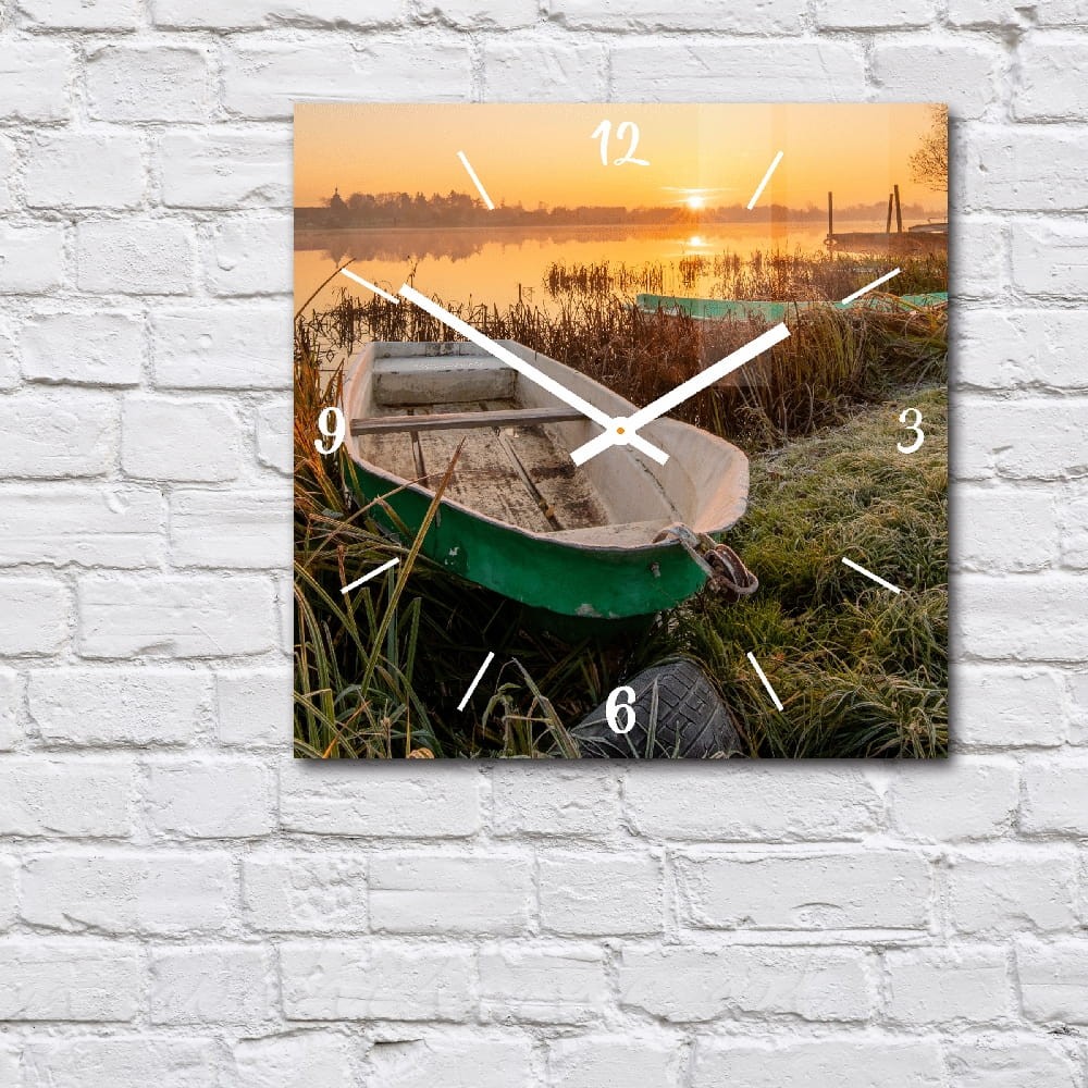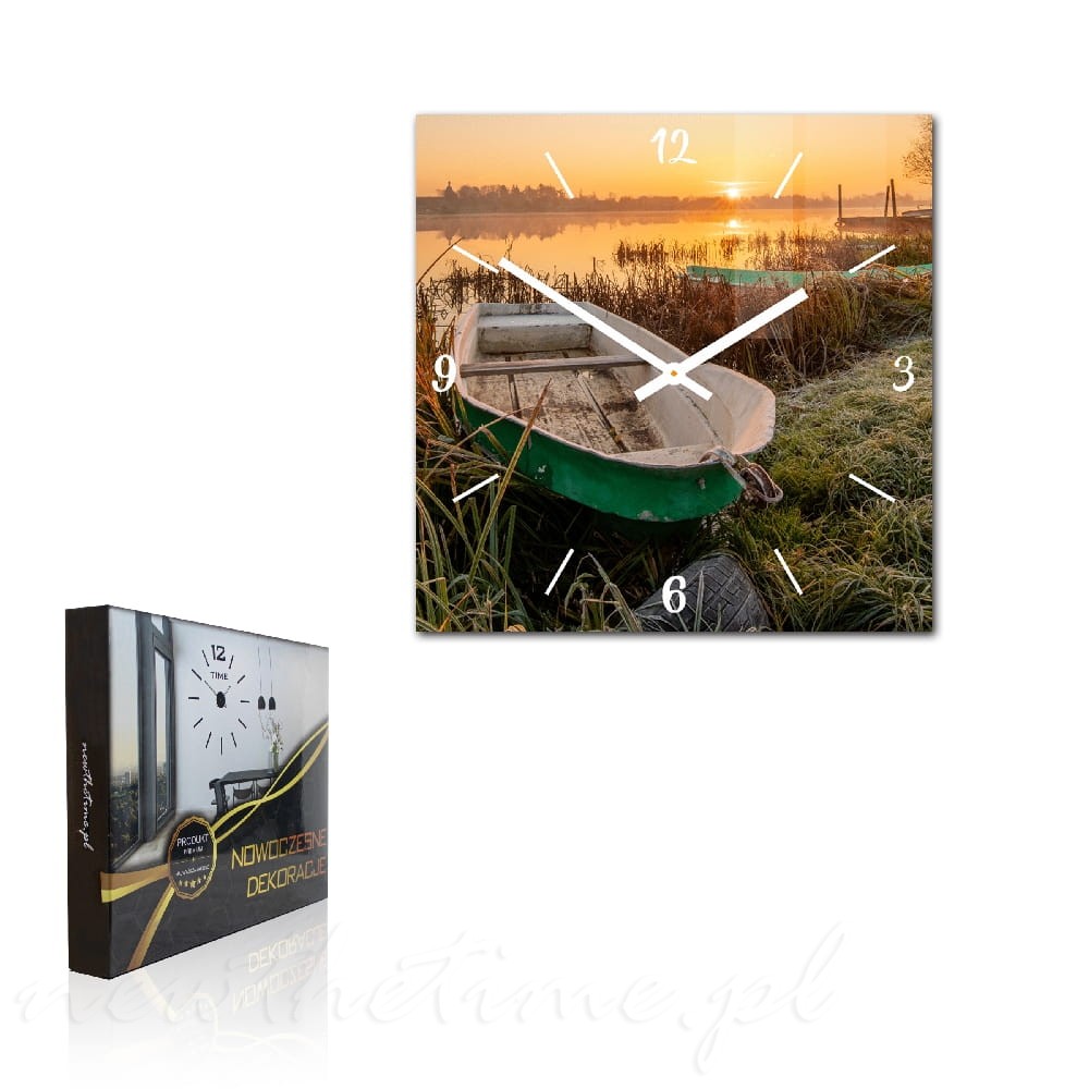 Zegar ścienny szklany Łódź - wschód słońca, woda, kwadratowy, 30 cm