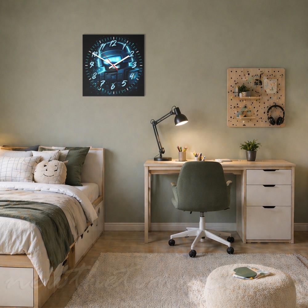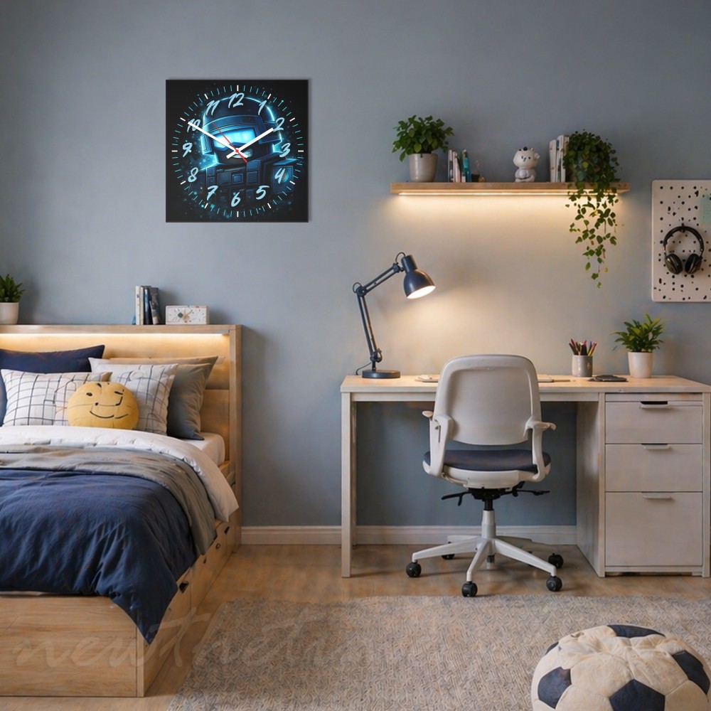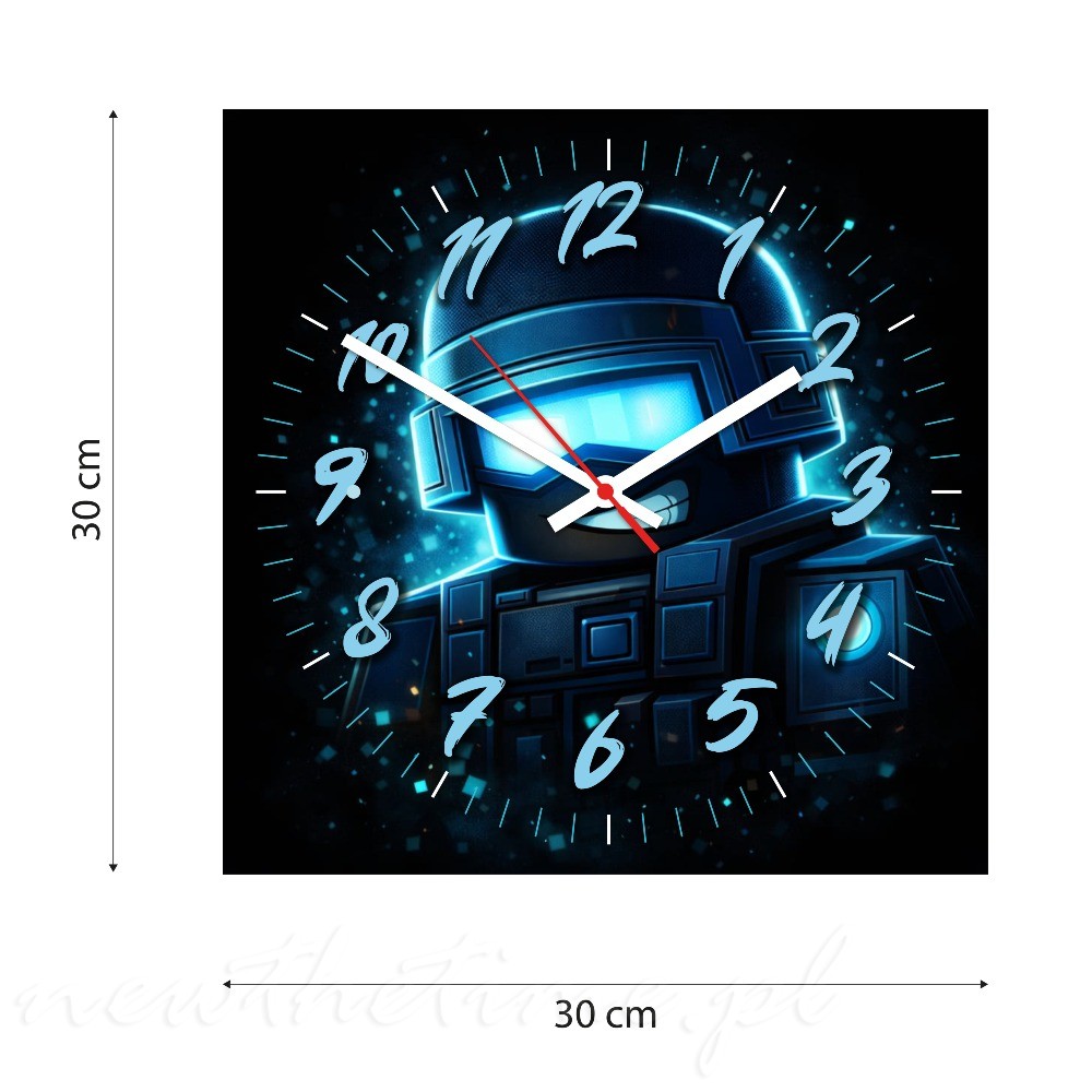 Zegar ścienny żołnierz gaming niebieski 30x30 cm to nowoczesny zegar młodzieżowy wykonany z trwałej i lekkiej płyty PVC o grubości 3 mm.