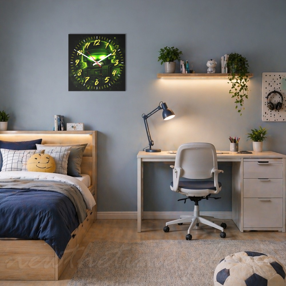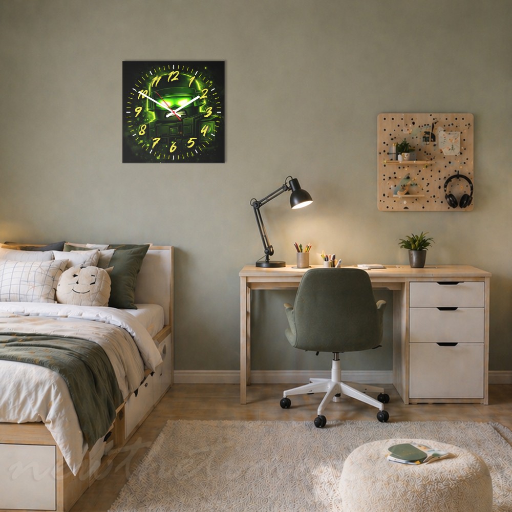 Motyw inspirowany stylem militarnym i gamingowym został podkreślony zielonym efektem świetlnym, który nadaje zegarowi charakteru i nowoczesnego wyglądu. To idealna dekoracja do pokoju młodzieżowego lub gamingowego setupu.