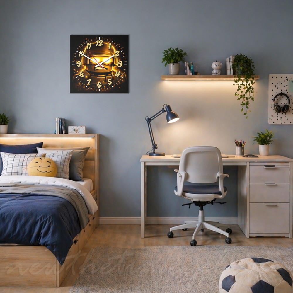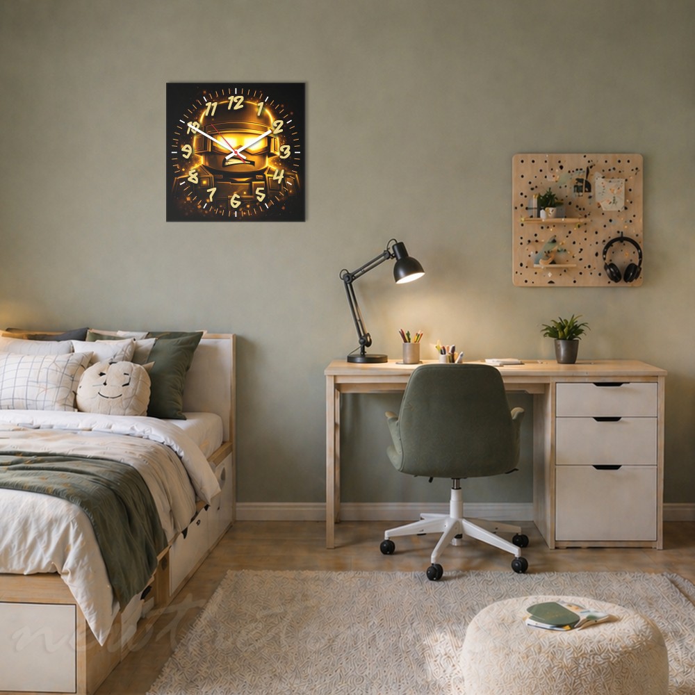 Motyw żołnierza w połączeniu ze złotym efektem świetlnym tworzy dynamiczny, wyrazisty design inspirowany światem gier i stylu taktycznego. Intensywna kolorystyka sprawia, że zegar wyróżnia się na ścianie i przyciąga uwagę.