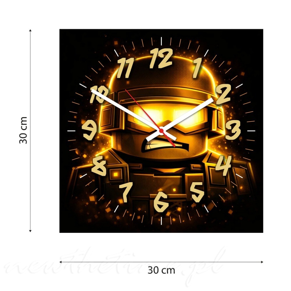 Zegar ścienny żołnierz gaming złoty 30x30 cm to nowoczesny zegar wykonany z lekkiej i trwałej płyty PVC 3 mm.